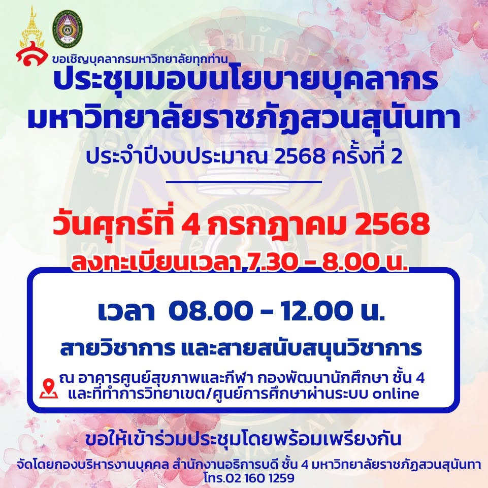 On Friday, July 4, 2025, Dr. Natnichar Kleep Buabarn, Acting Head of the Internal Audit Unit, along with Internal Audit Unit personnel, attended the 2nd Personnel Meeting to Provide Policy for Fiscal Year 2025 at the Health and Sports Center Building, 4th Floor, Suan Sunandha Rajabhat University.