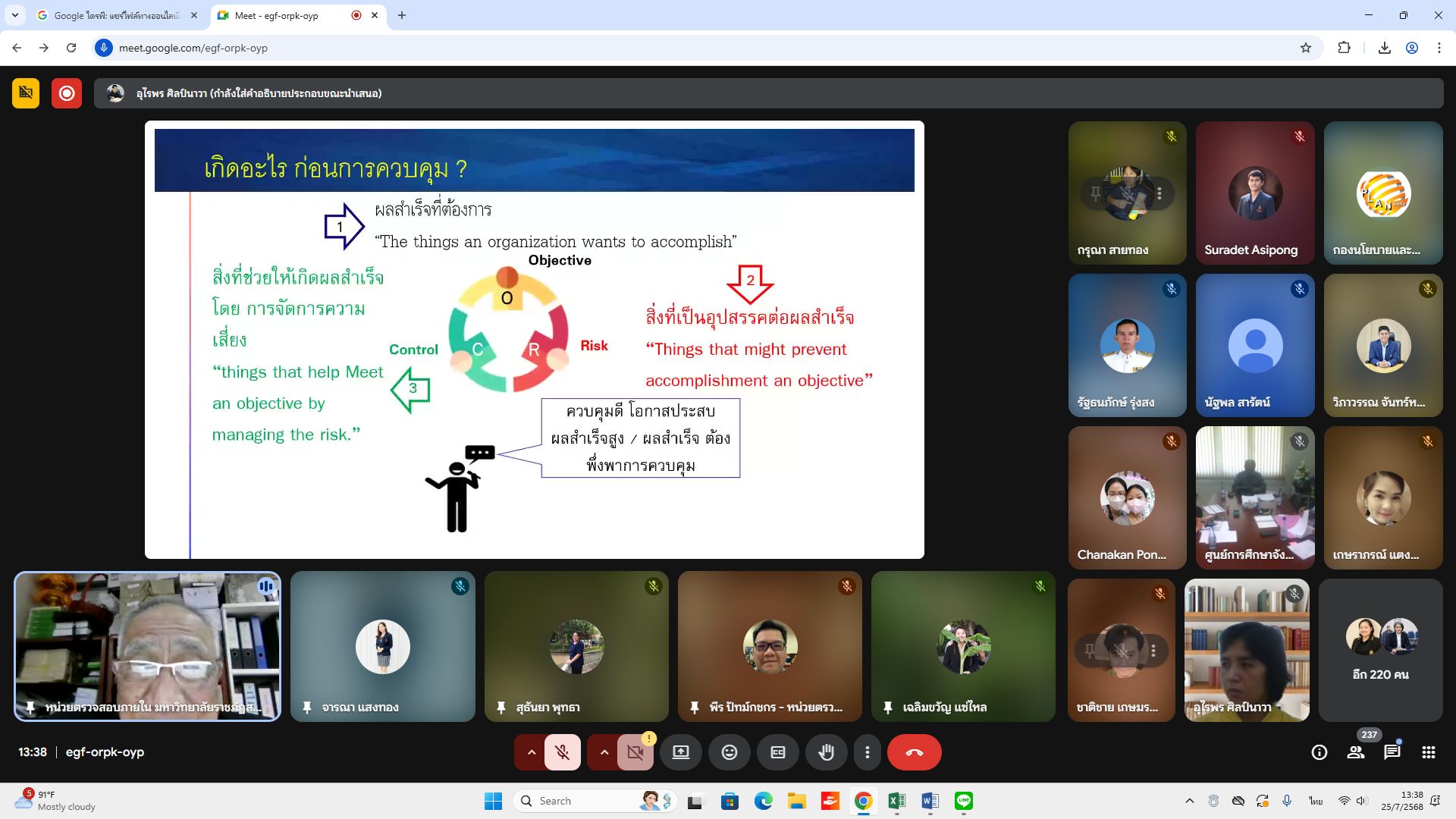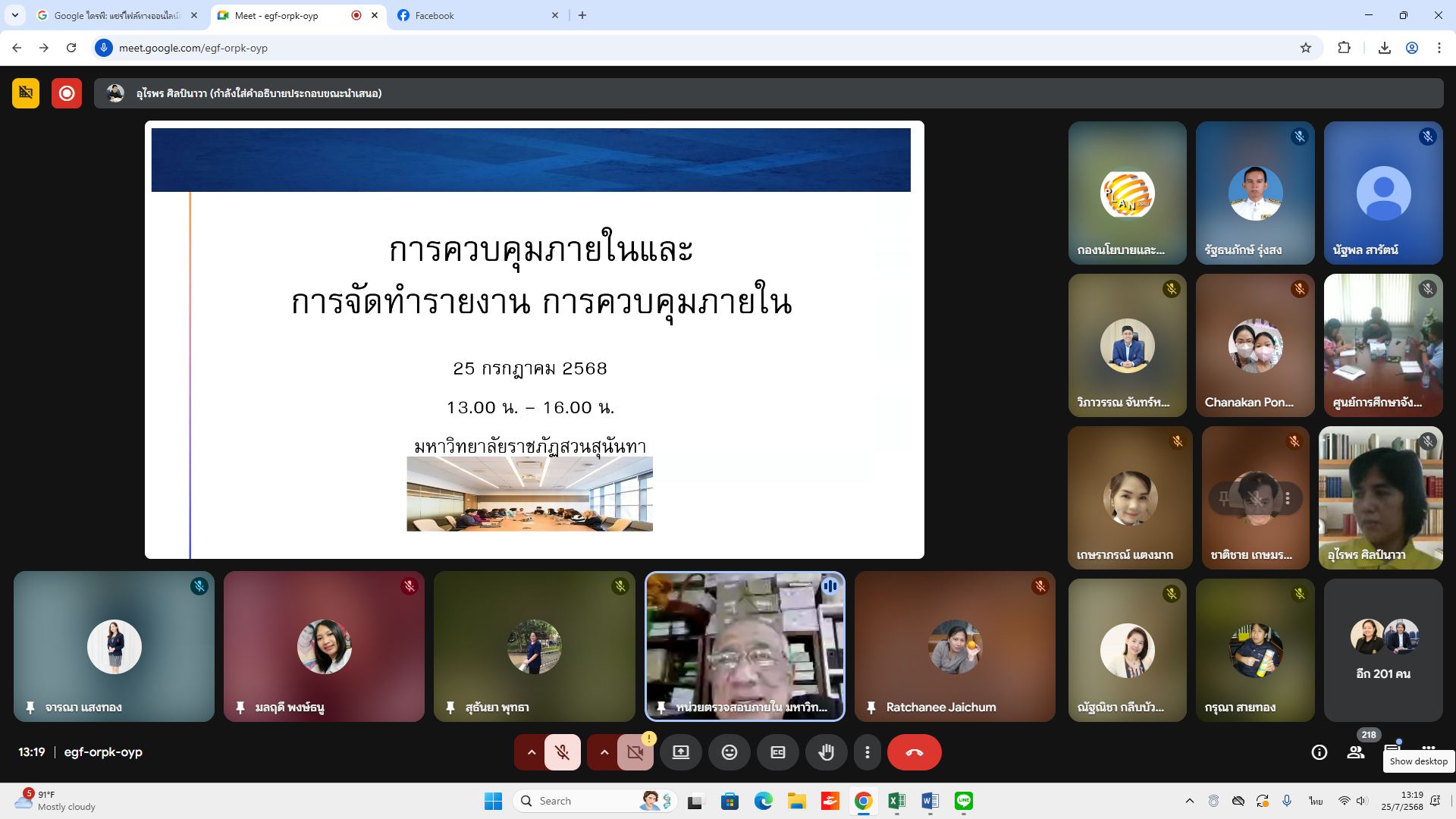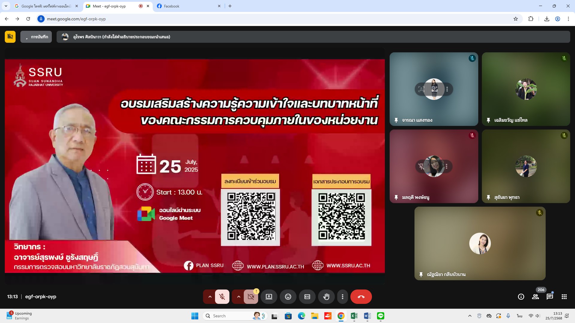 Friday, July 25, 2025, 1:00 p.m. - 4:00 p.m. Internal Audit Unit personnel participated in the training program "Enhance knowledge and understanding and roles of the agency's internal control committee" via the online Google Meet system, organized by the Policy and Planning Division.