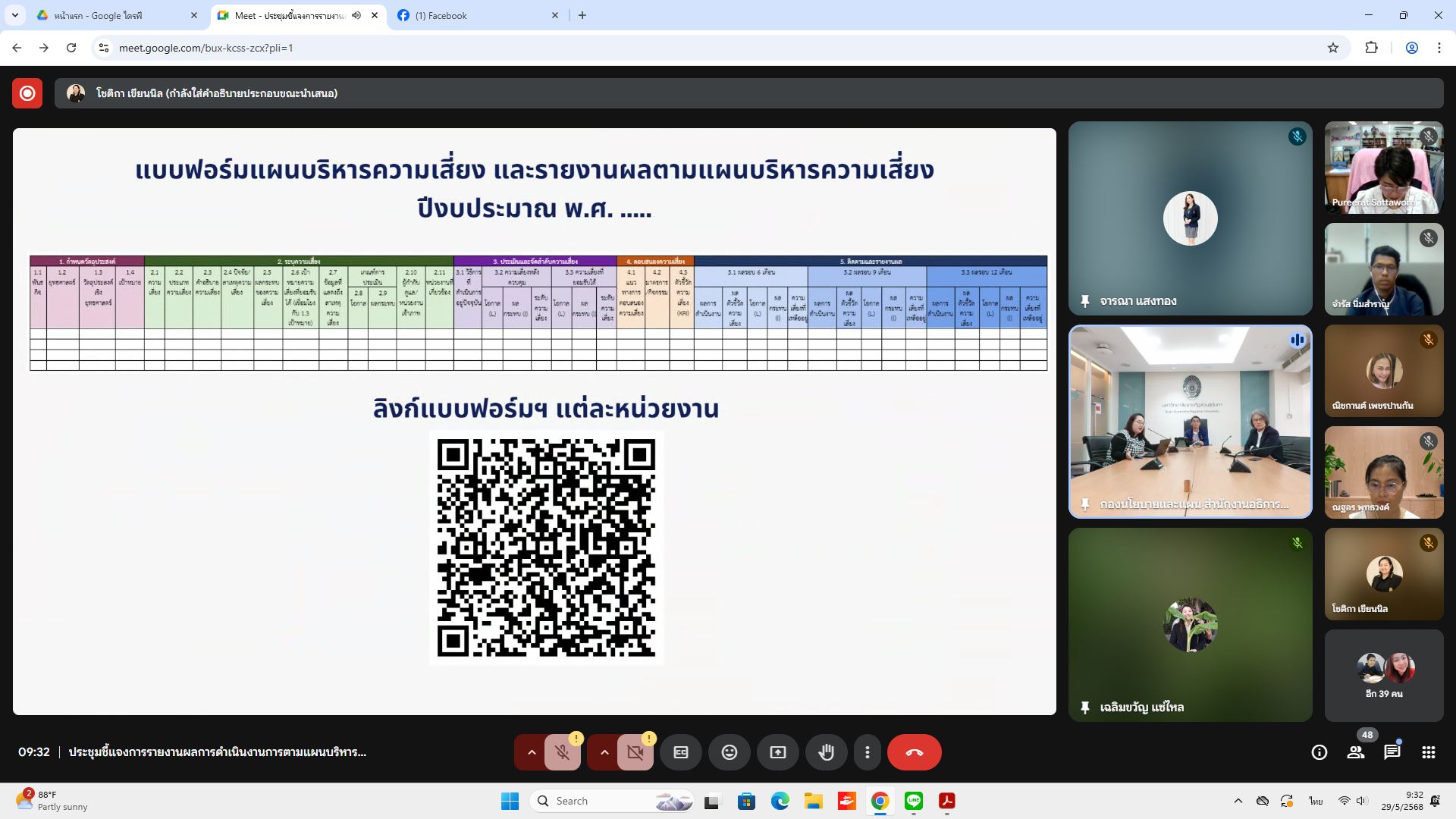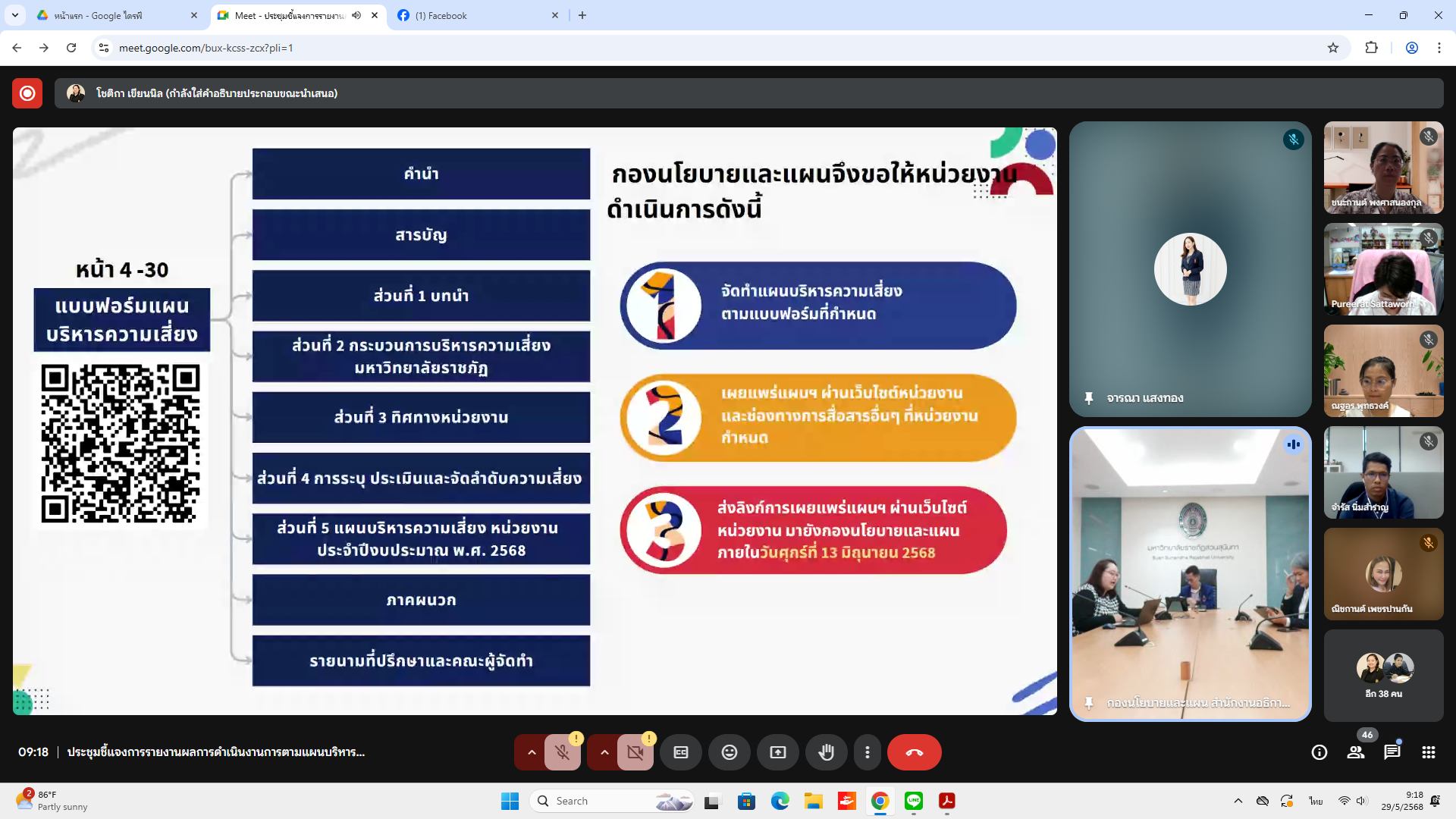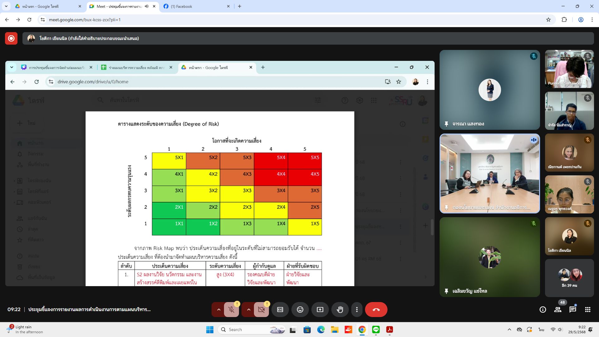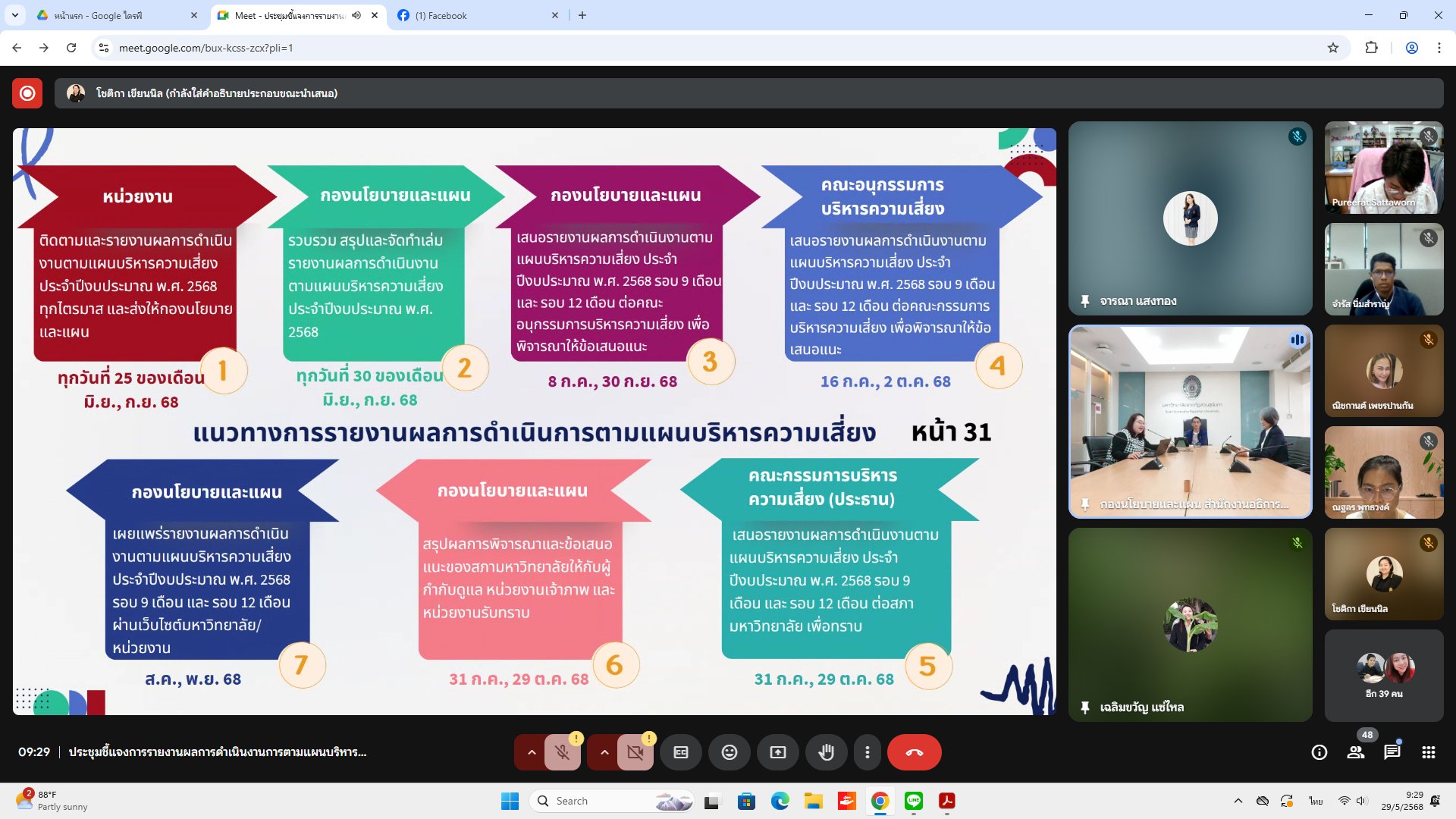 On Thursday, May 29, 2025 at 9:00 a.m., Ms. Jarana Sangthong and Ms. Chalermkwan Saelai attended the meeting to clarify the performance report according to the risk management plan for fiscal year 2025 at the agency level via the online Google Meet system.
