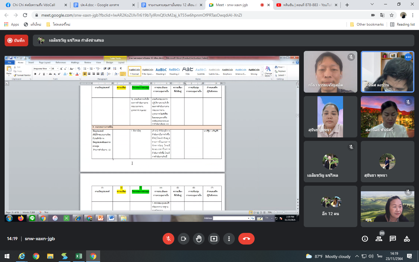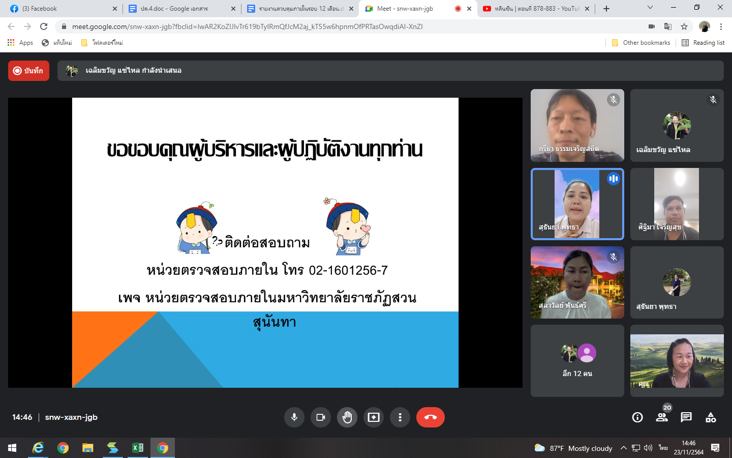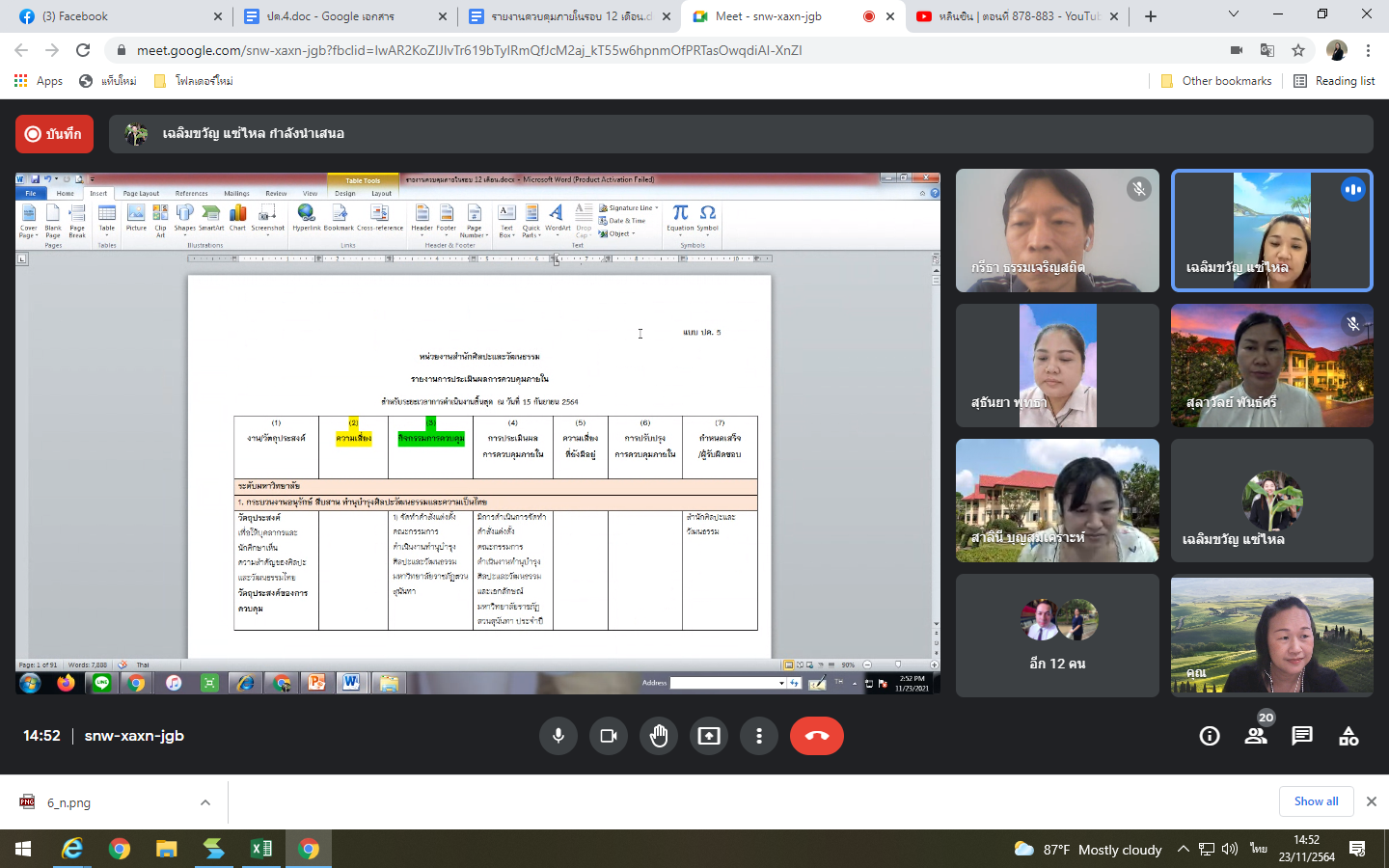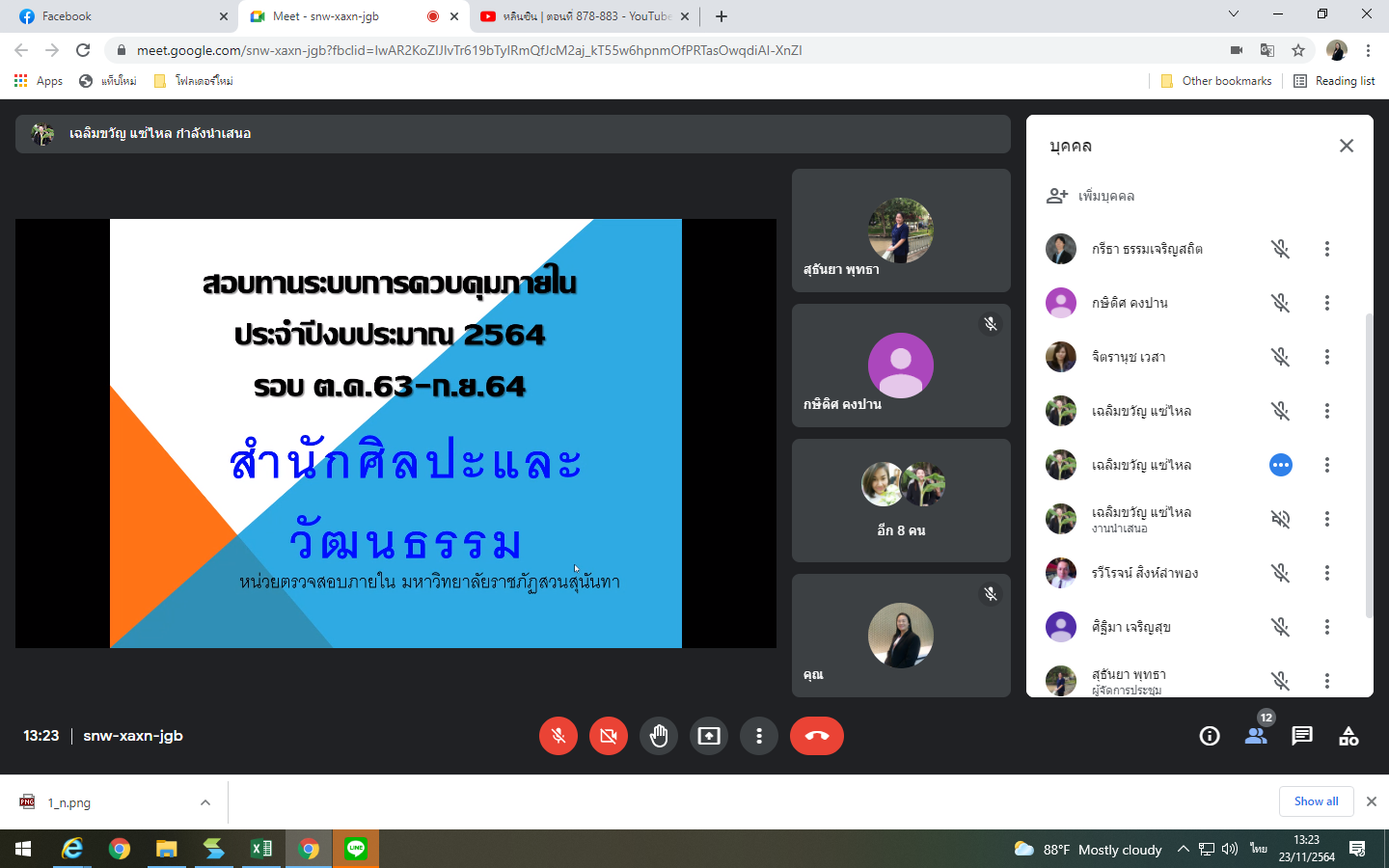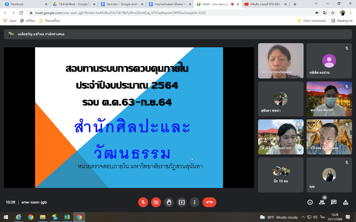 Tuesday, November 23, 2021 at 1:30 p.m. The Internal Audit Unit reviewed the establishment of the internal control system of the Office of Arts and Culture through the online meeting of the Google Meet program.