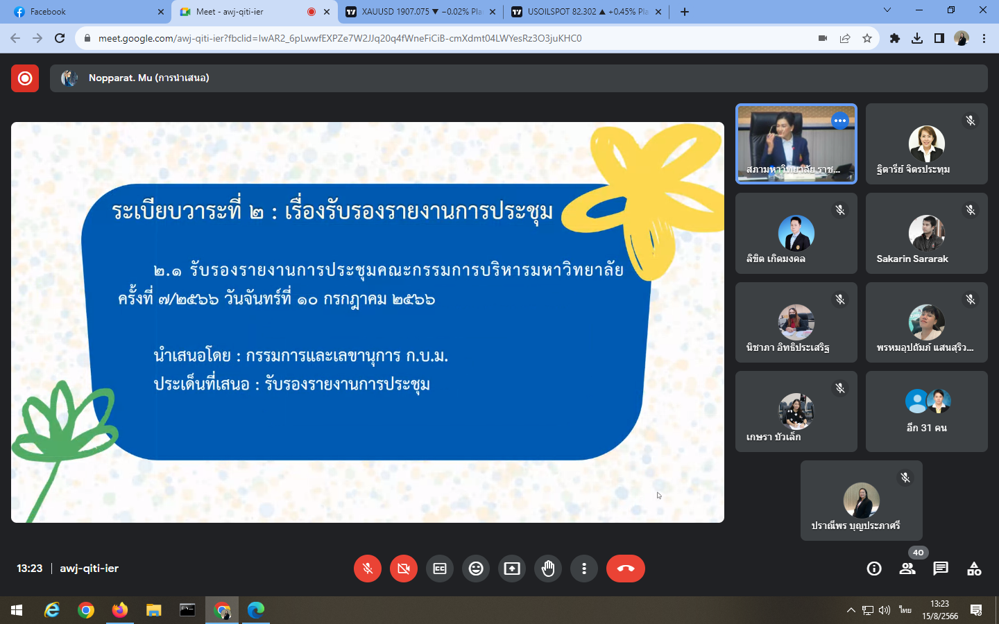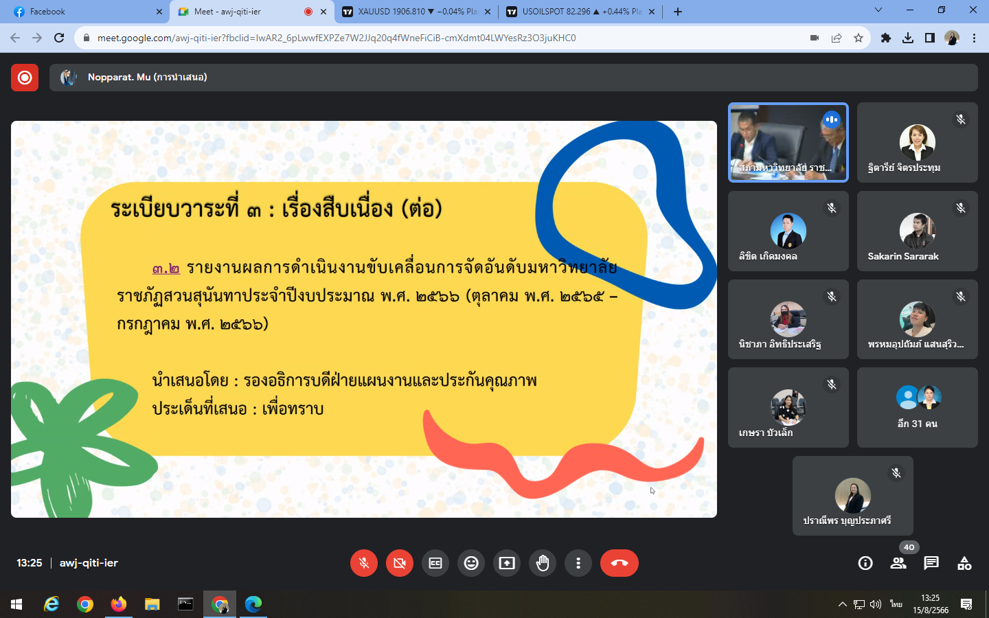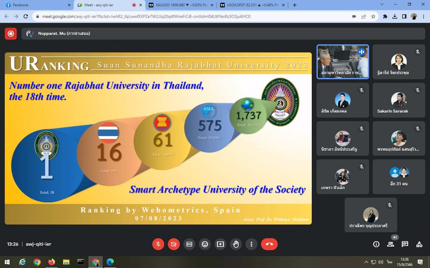 Tuesday, August 15, 2023 at 1:00 p.m. - 4:00 p.m. Mrs. Praneepohn Boonpraphasri, Head of Internal Audit Unit attending university administration meetings Suan Sunandha Rajabhat University No. 8/2023 at the university council meeting room, 5th floor, building 31 and online system Google Meet.