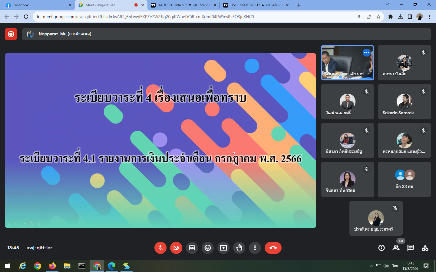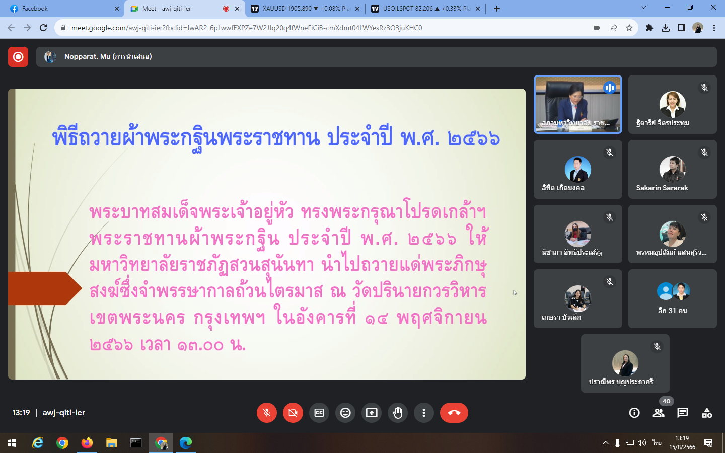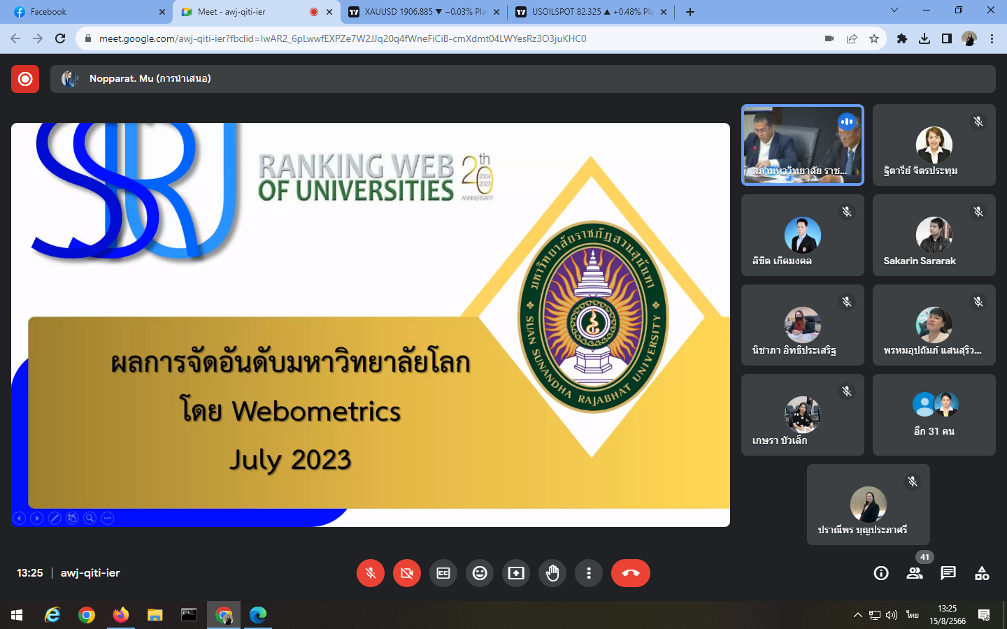 Tuesday, August 15, 2023 at 1:00 p.m. - 4:00 p.m. Mrs. Praneepohn Boonpraphasri, Head of Internal Audit Unit attending university administration meetings Suan Sunandha Rajabhat University No. 8/2023 at the university council meeting room, 5th floor, building 31 and online system Google Meet.