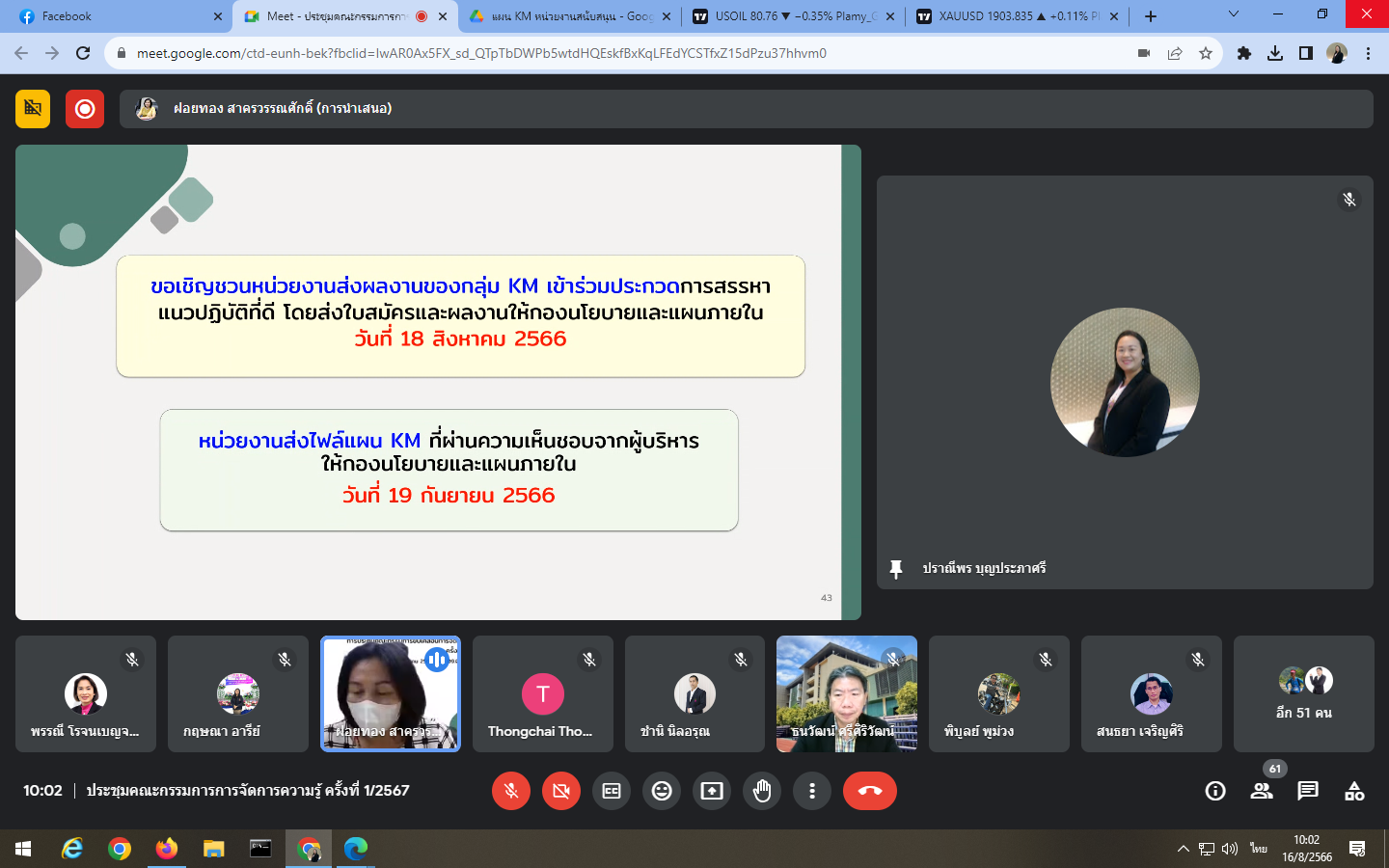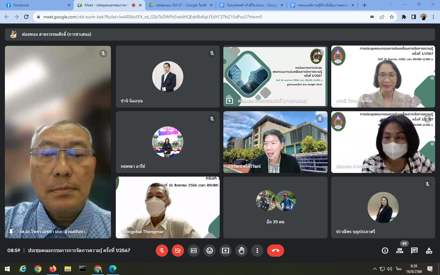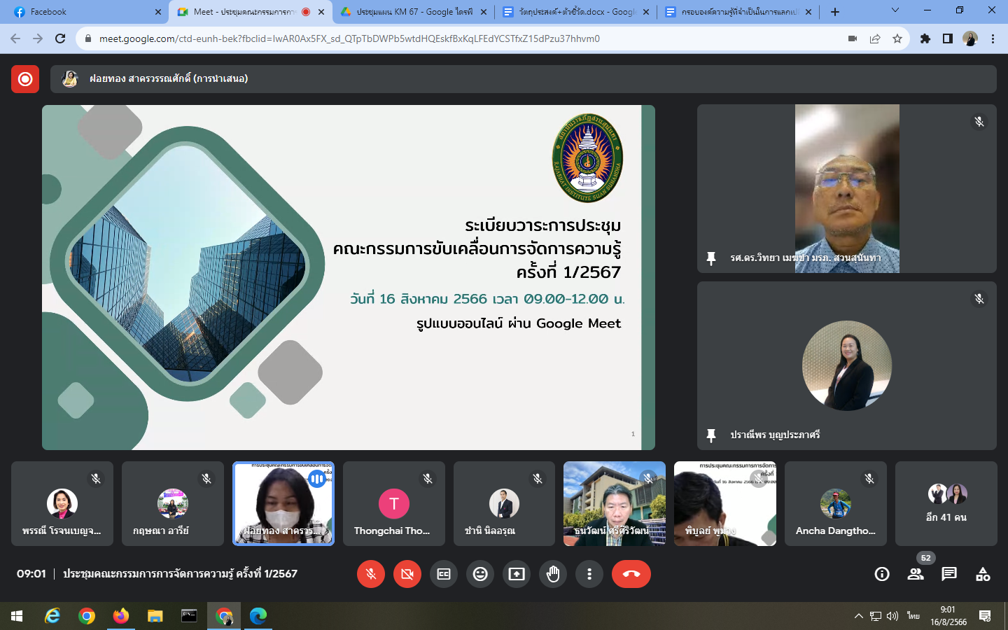 Wednesday, August 16, 2023 at 9:00 a.m. - 12:00 noon Mrs. Praneepohn Boonpraphasri, Head of Internal Audit Unit and Ms. Suthanya Putta attended the knowledge management committee meeting No. 1/2024 organized by the Policy and Planning Division through an online meeting, Google Meet.