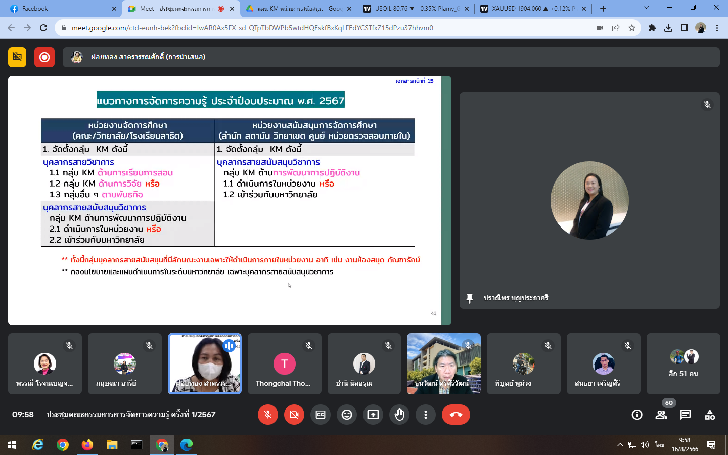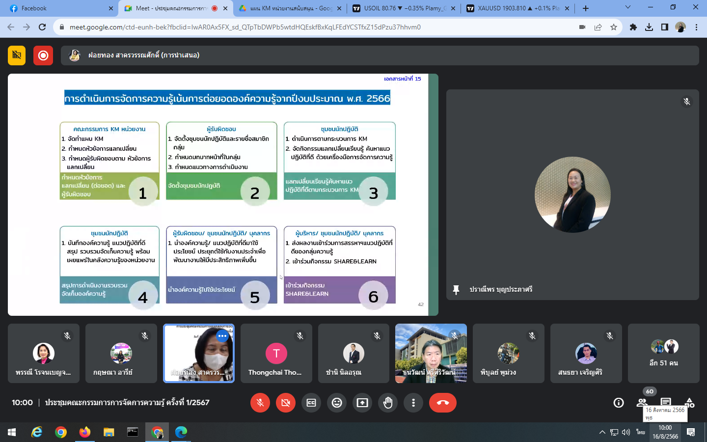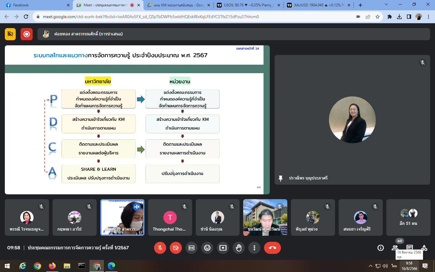 Wednesday, August 16, 2023 at 9:00 a.m. - 12:00 noon Mrs. Praneepohn Boonpraphasri, Head of Internal Audit Unit and Ms. Suthanya Putta attended the knowledge management committee meeting No. 1/2024 organized by the Policy and Planning Division through an online meeting, Google Meet.