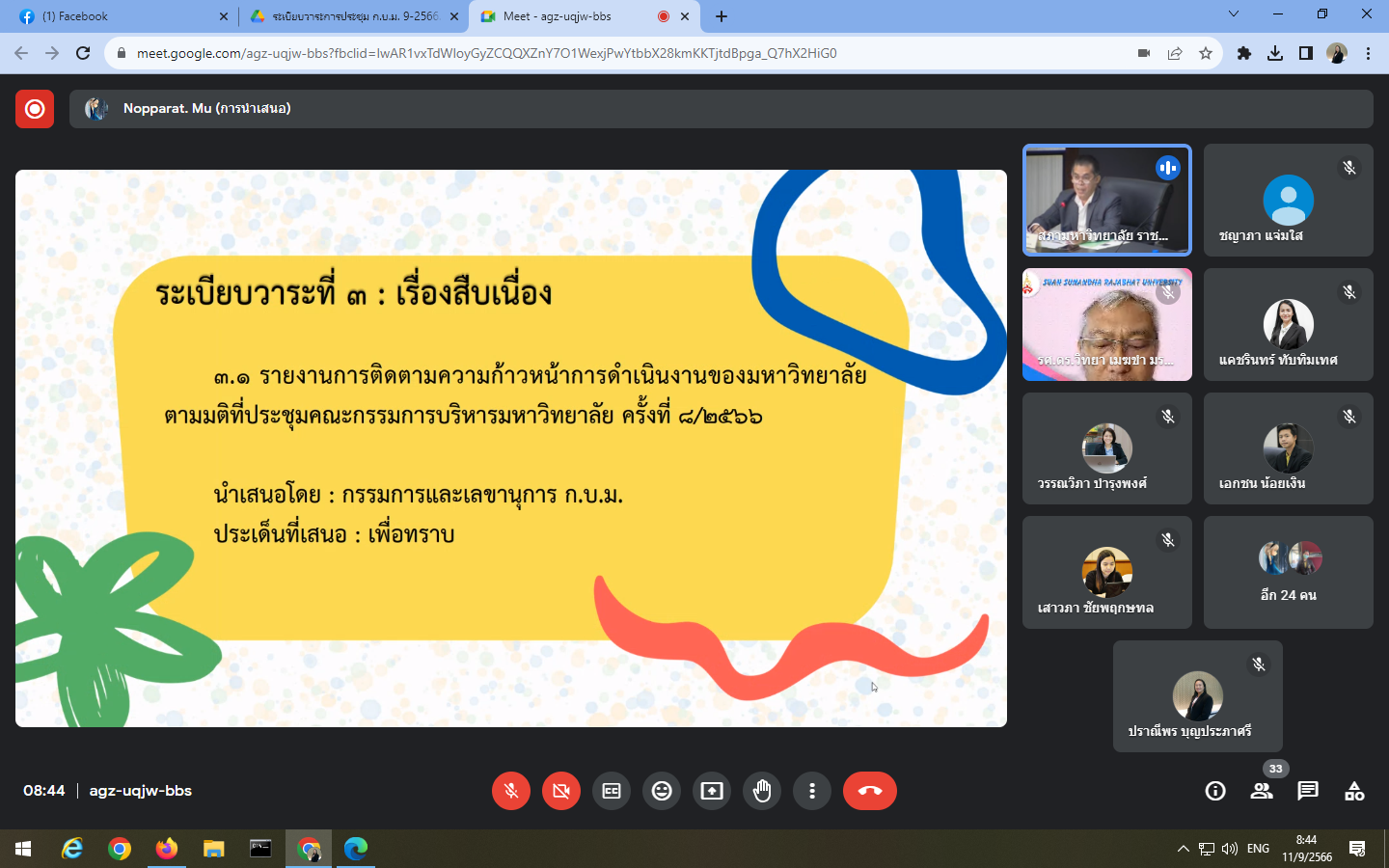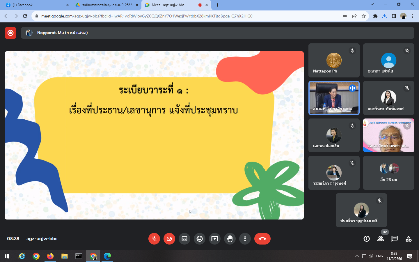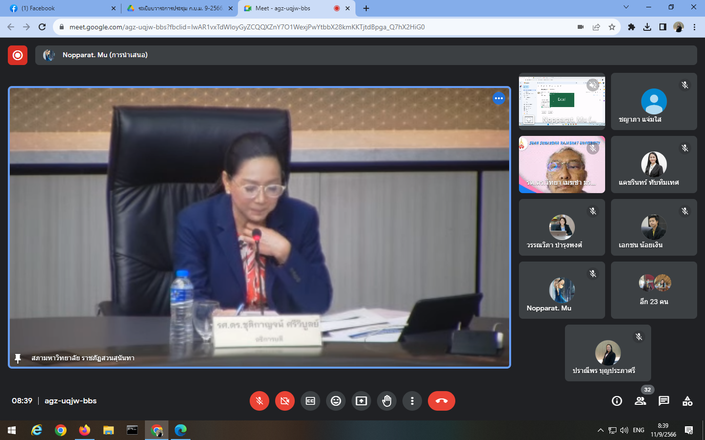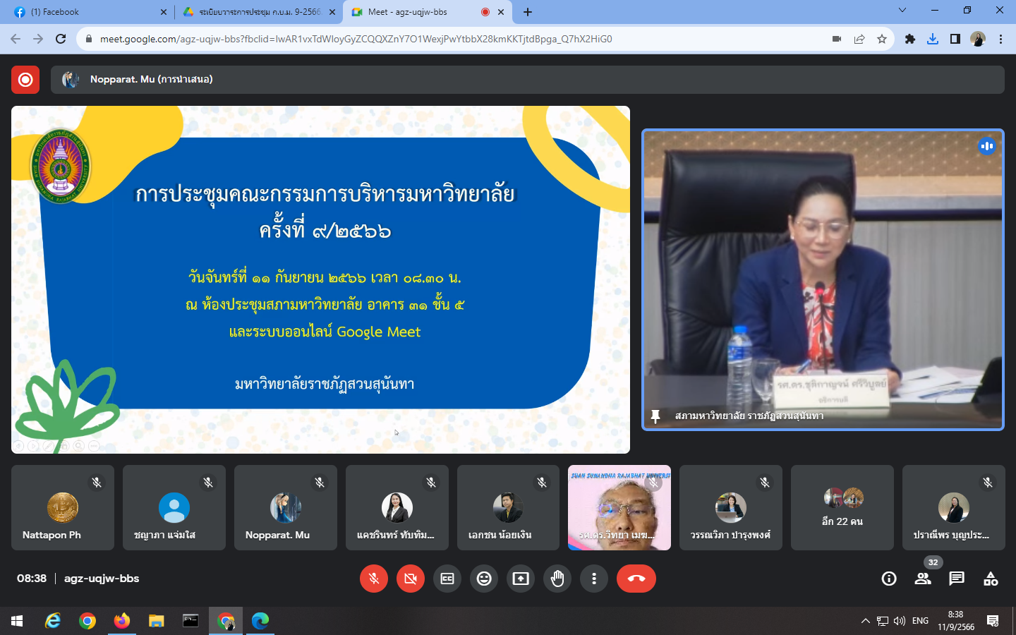 Monday, September 11, 2023, 8:30 a.m. - 12:00 p.m. Mrs. Praneepohn Bunpraphasri, Head of the Internal Audit Unit Attend the university executive committee meeting Suan Sunandha Rajabhat University No. 9/2023 at the University Council meeting room, 5th floor, Building 31, and the Google Meet online system.