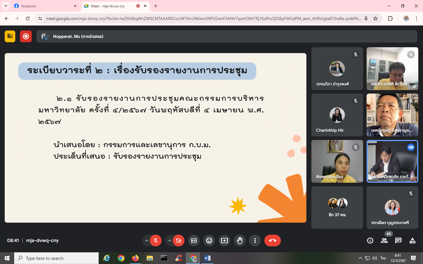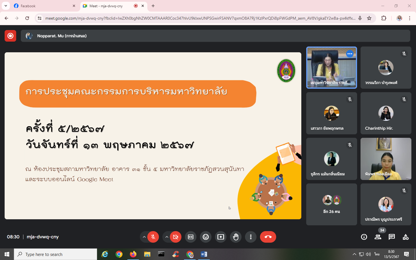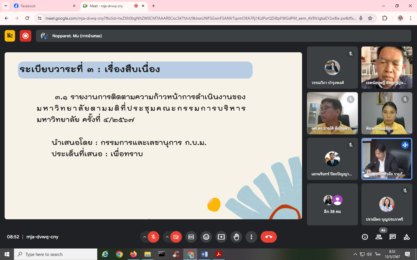 Monday, May 13, 2024, time 8:30 a.m. - 12:00 p.m. Mrs. Praneepohn Boonprapasri, Head of Internal Audit Unit Attended the University Executive Committee meeting No. 5/2024 via the online Google Meet system.