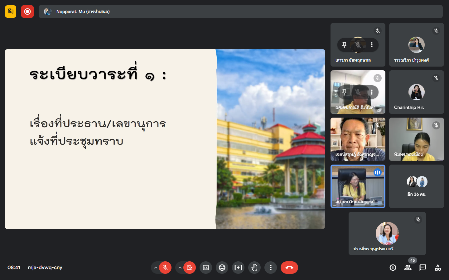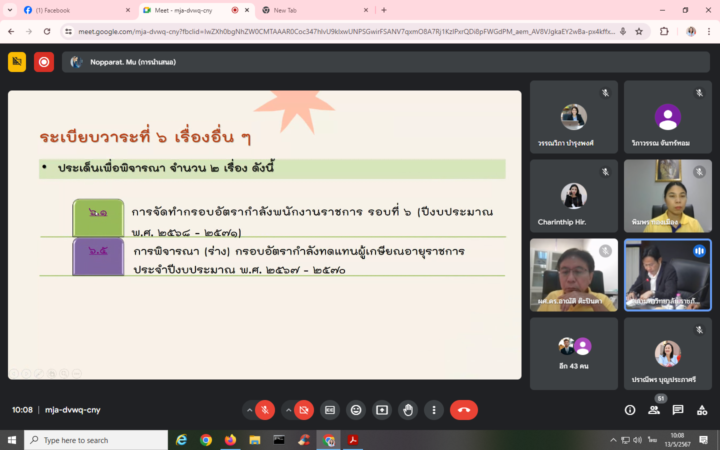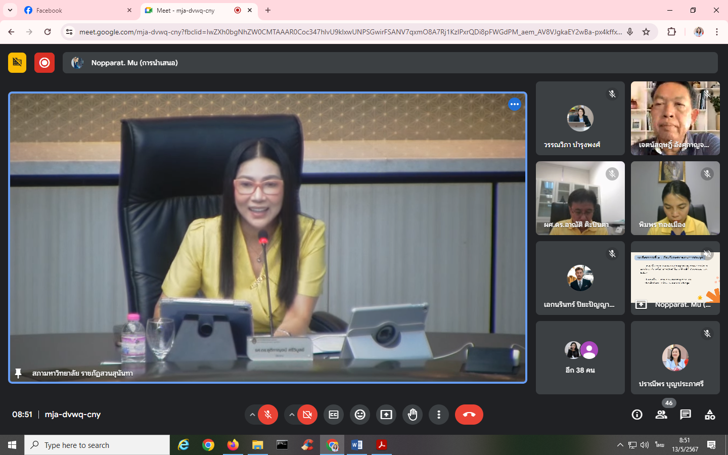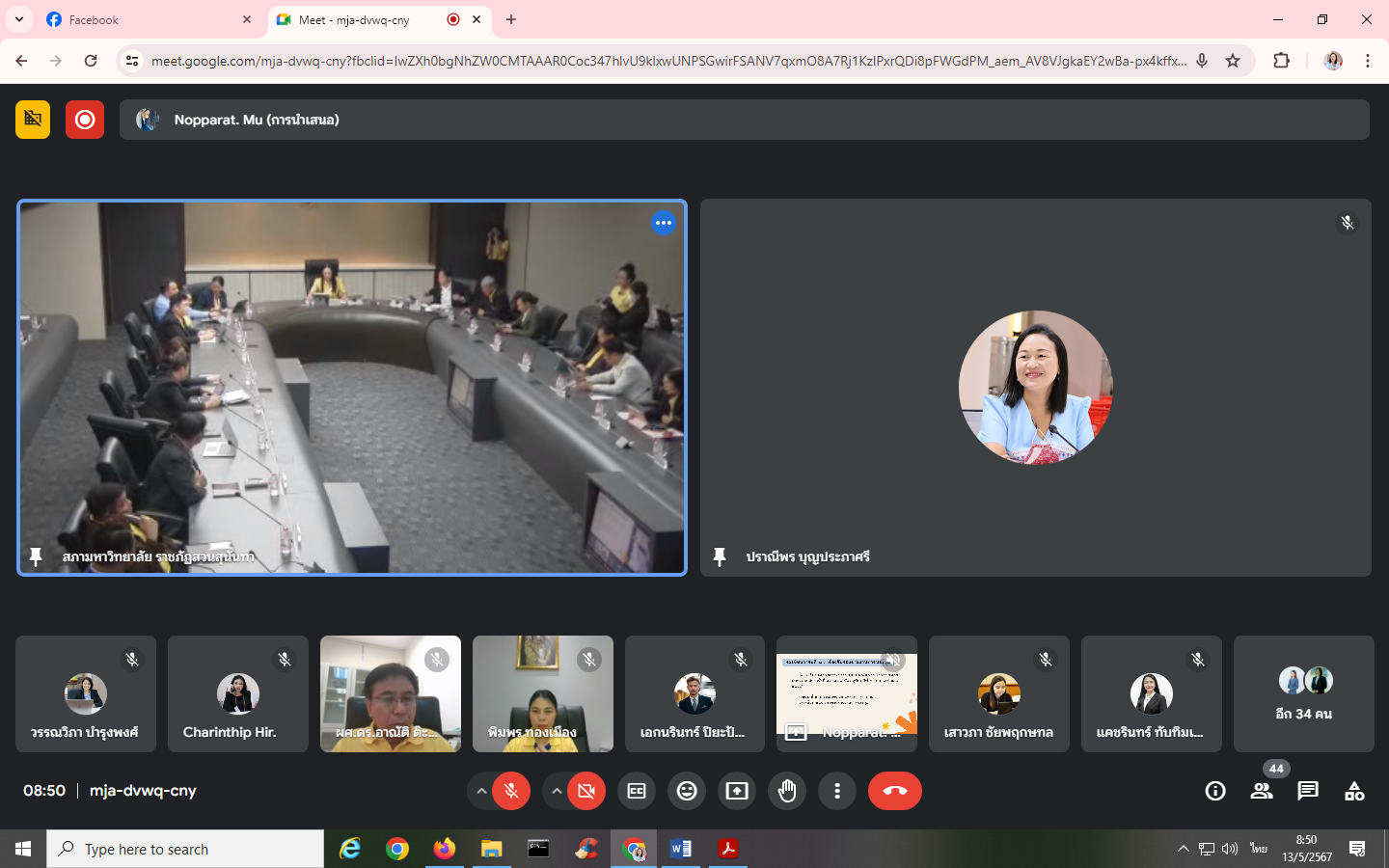 Monday, May 13, 2024, time 8:30 a.m. - 12:00 p.m. Mrs. Praneepohn Boonprapasri, Head of Internal Audit Unit Attended the University Executive Committee meeting No. 5/2024 via the online Google Meet system.