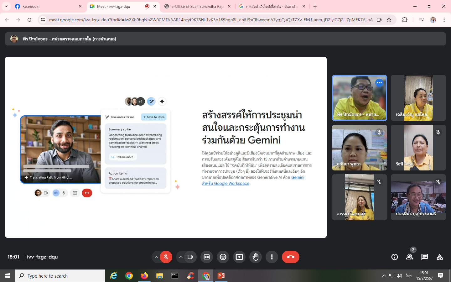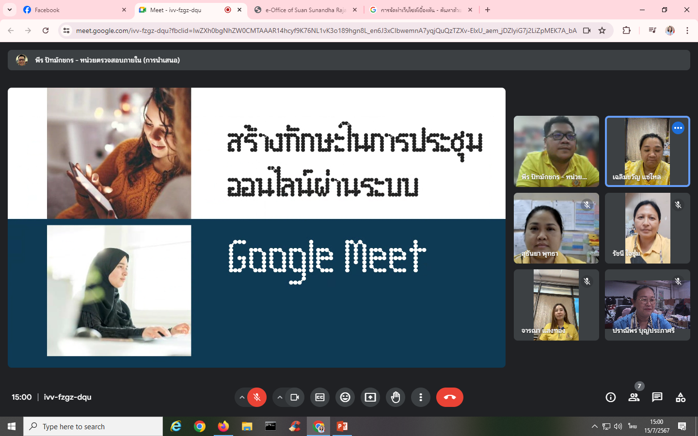 Monday, July 15, 2024, Internal Audit Unit personnel attended training for the project to develop personnel in the organization to have digital skills and culture for working together. Activity 1 "Build skills in online meetings through the Google Meet system" With Mr. Peera Patkotchakorn as a speaker through the online Google Meet system.