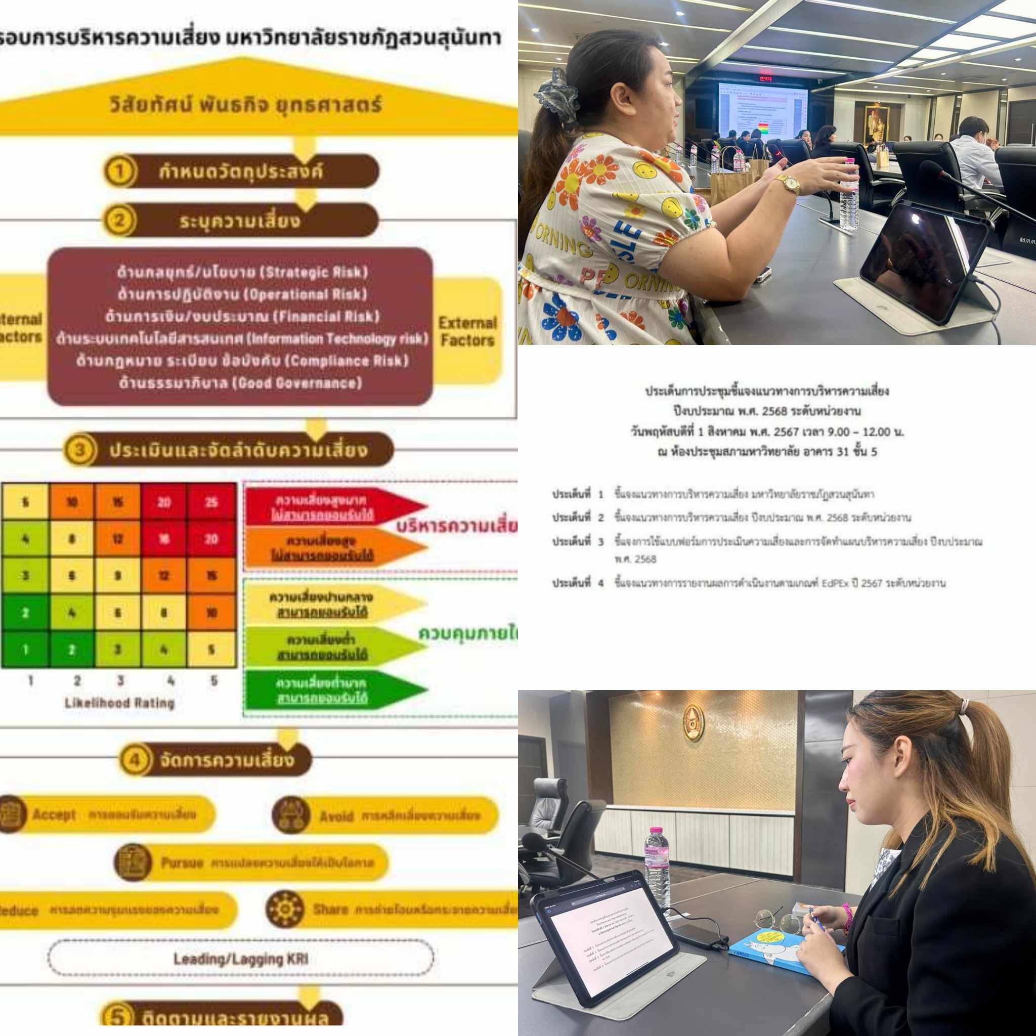 Thursday, August 1, 2024 at 9:00 a.m. Ms. Chalermkwan Saelai and Ms. Jarana Saengthong attended the meeting to explain risk management guidelines. Fiscal year 2025 at the University Council meeting room, 5th floor, Building 31, organized by the Policy and Planning Division. Suan Sunandha Rajabhat University.