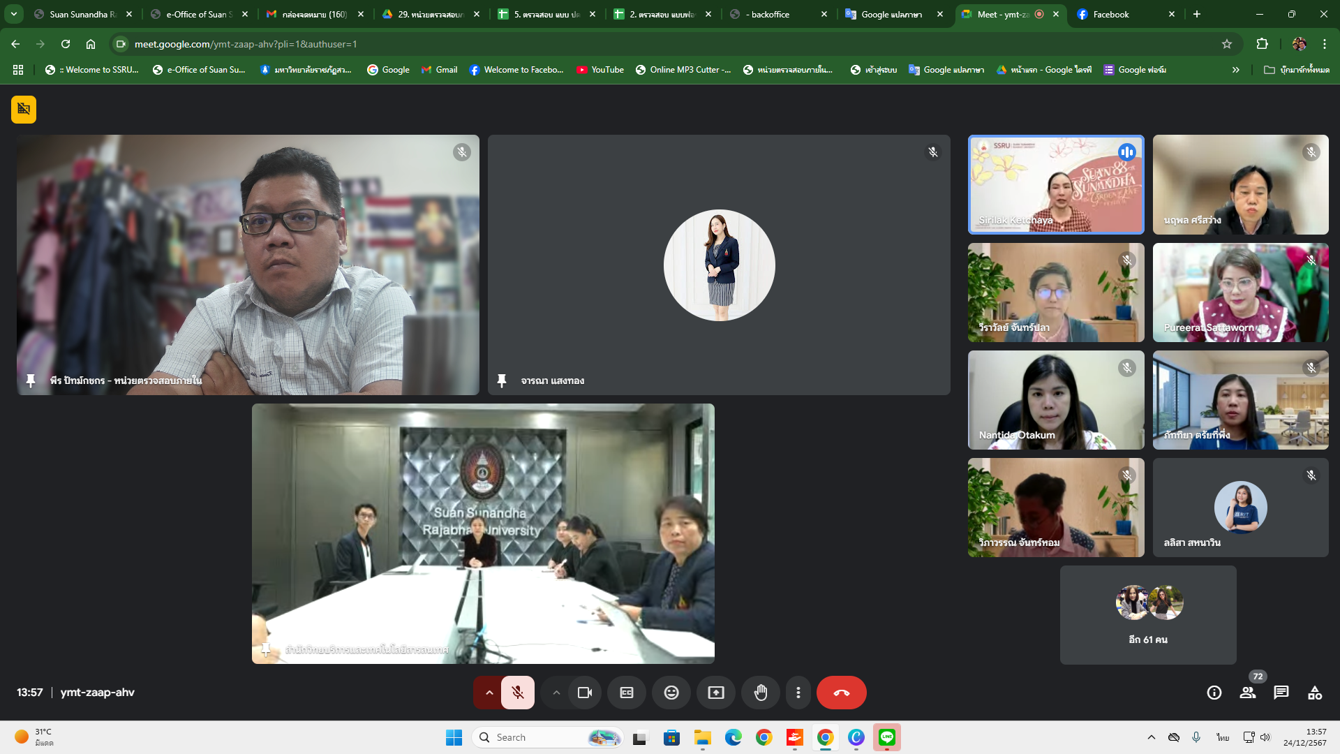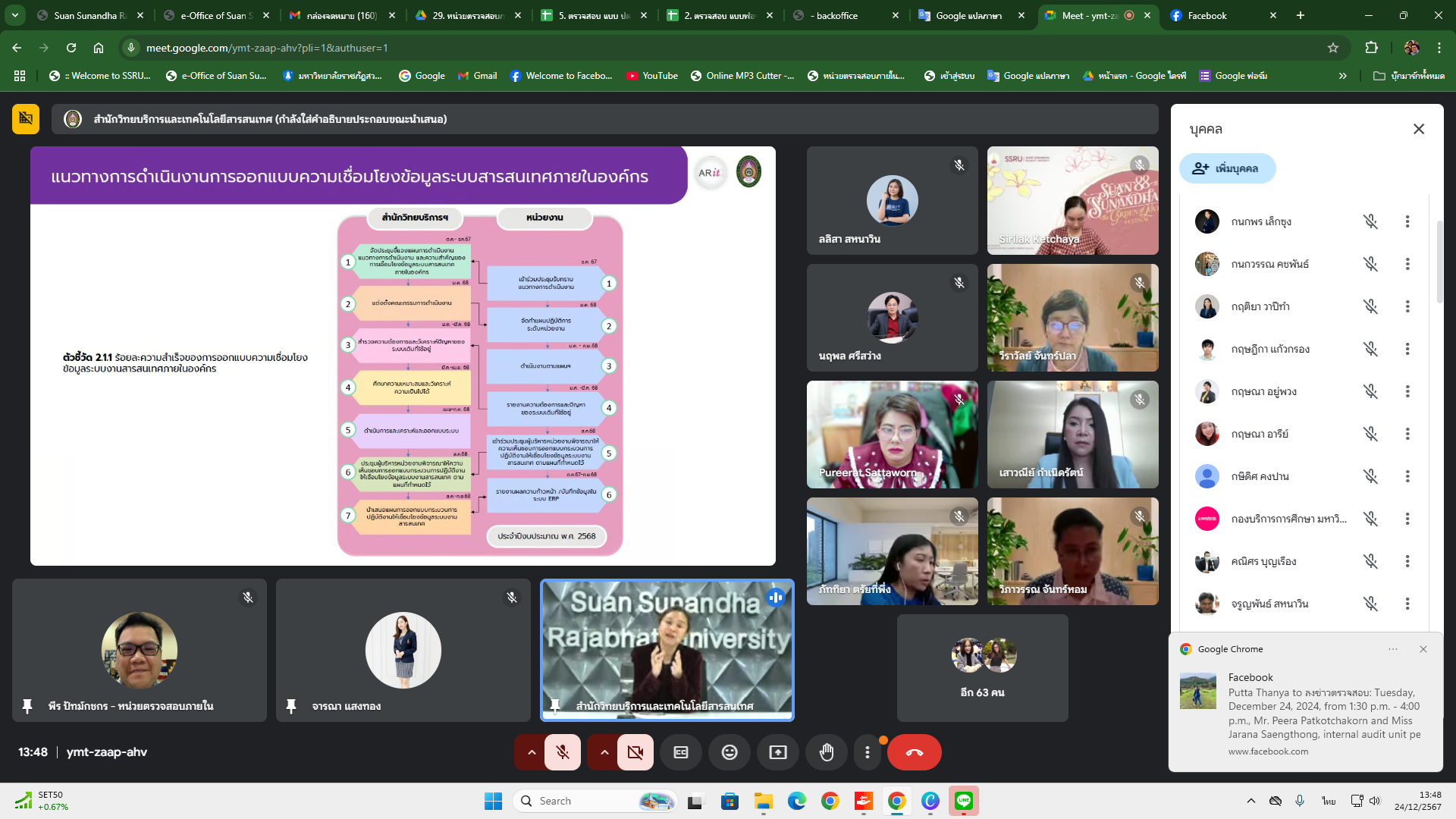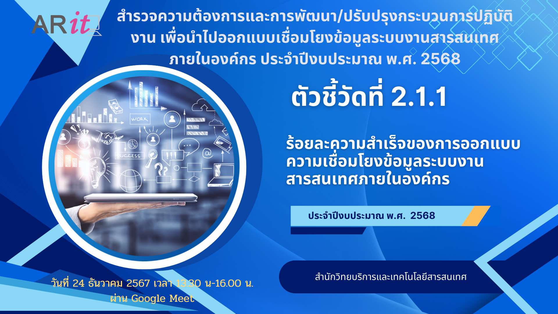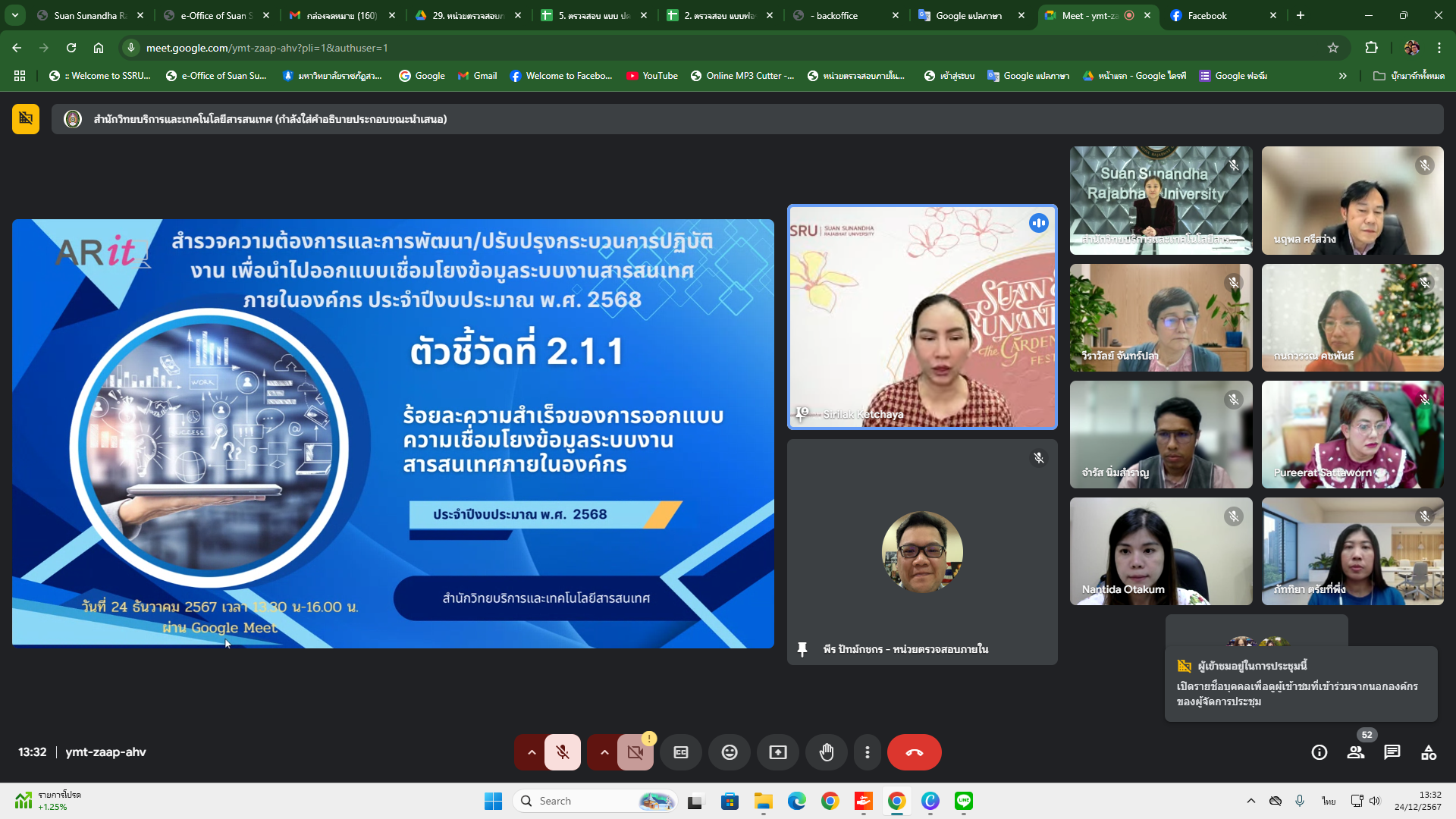 Tuesday, December 24, 2024, from 1:30 p.m. - 4:00 p.m., Mr. Peera Patkotchakorn and Miss Jarana Saengthong, internal audit unit personnel Attend the meeting Survey needs and develop/improve operational processes. To be used to design and link data to information systems within the organization. Fiscal year 2025 Indicator 2.1.1 Percentage of success in designing data connections to information systems within the organization. Through the online Google Meet system, organized by the Office of Academic Resources and Information Technology.
