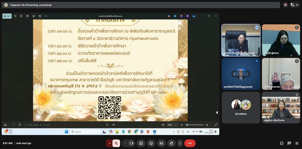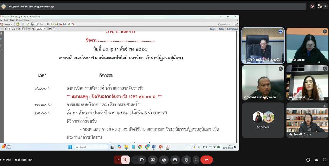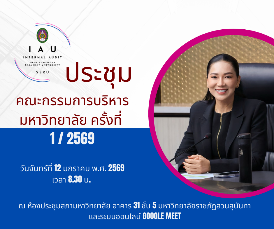 วันจันทร์ที่ 12 มกราคม พ.ศ. 2569 เวลา 8.30 น. ดร.ณัฐณิชา กลีบบัวบาน หัวหน้าหน่วยตรวจสอบภายใน เข้าร่วมประชุมคณะกรรมการบริหารมหาวิทยาลัย ครั้งที่ 1/2569 ผ่านระบบออนไลน์ Google Meet โดยมี รองศาสตราจารย์ ดร.ชุติกาญจน์ ศรีวิบูลย์ อธิการบดี เป็นประธานในการประชุม