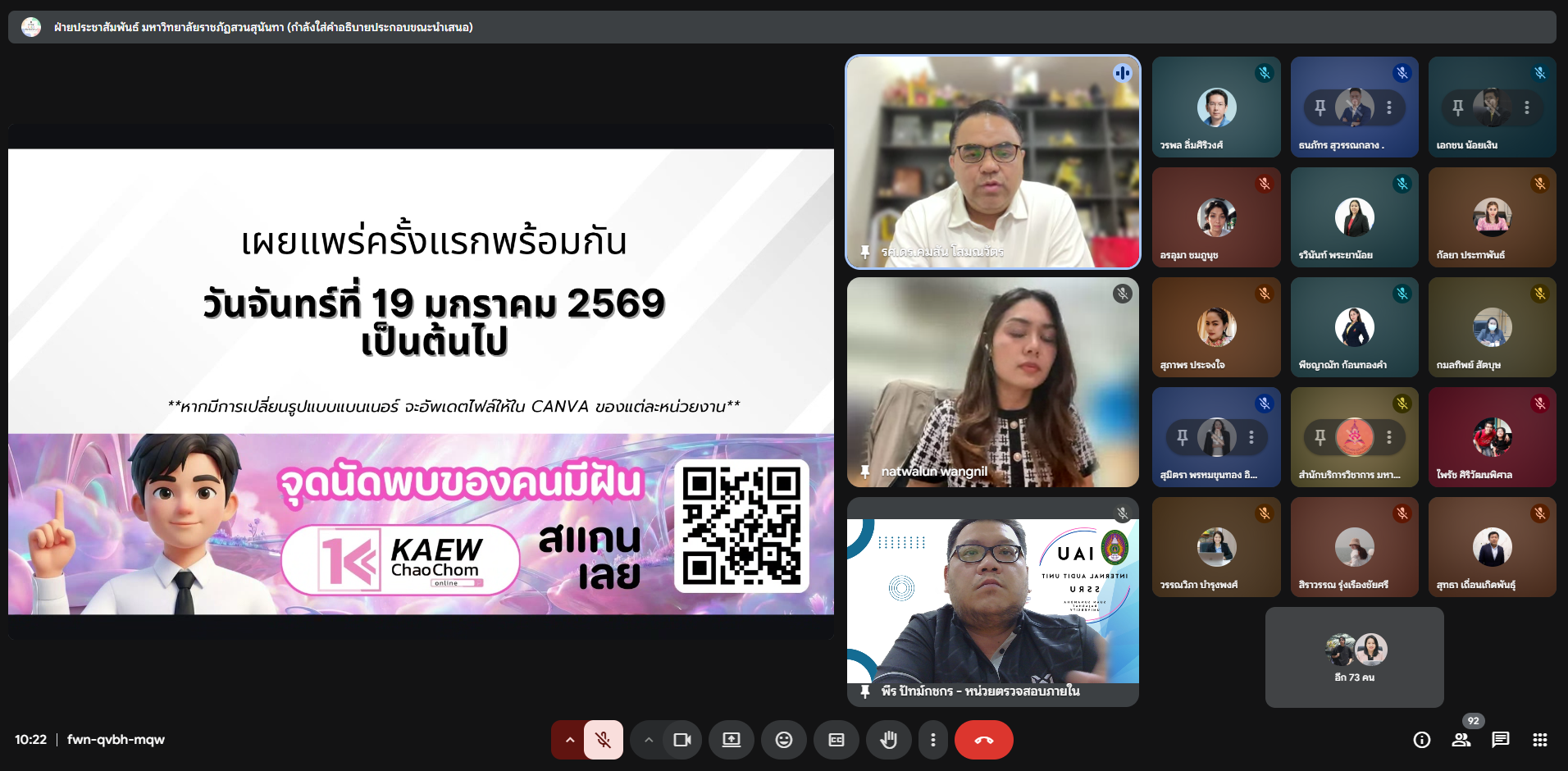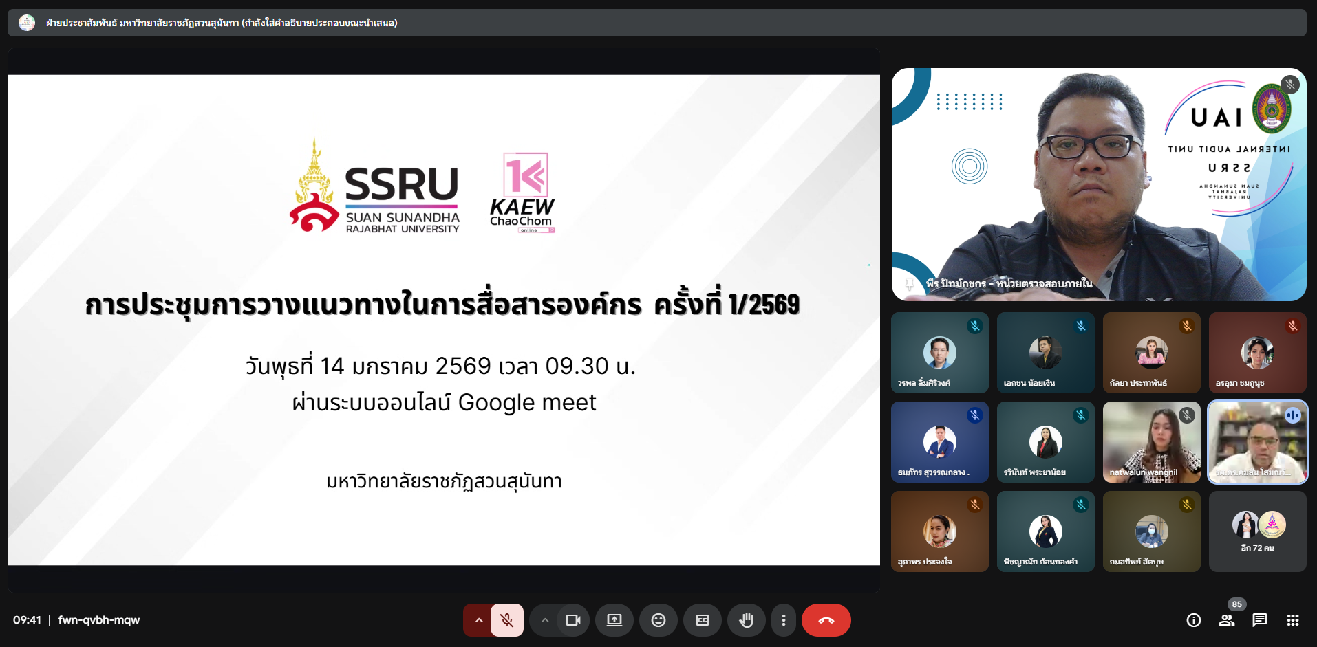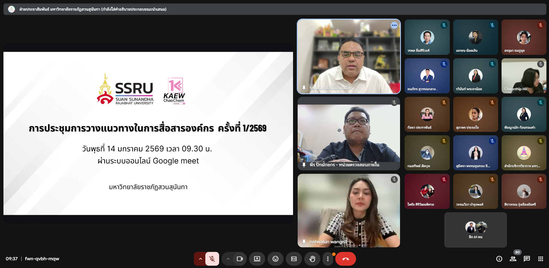 วันที่ 14 มกราคม 2569 เวลา 09.30 น. นายพีระ ปัทม์กชกร เข้าร่วมประชุมการวางแนวทางในการสื่อสารองค์กร ครั้งที่ 1/2569 ผ่านระบบออนไลน์ โดยการประชุมดังกล่าว ฝ่ายประชาสัมพันธ์และโสตทัศนูปกรณ์ กองกลาง สำนักงานอธิการบดี จัดขึ้นเพื่อชี้แจงแนวทางในการปฏิบัติงานด้านการประชาสัมพันธ์สำหรับหน่วยงานต่าง ๆ ใช้เป็นในทิศทางเดียวกันและเป็นไปตามทิศทางที่มหาวิทยาลัยฯ กำหนด
