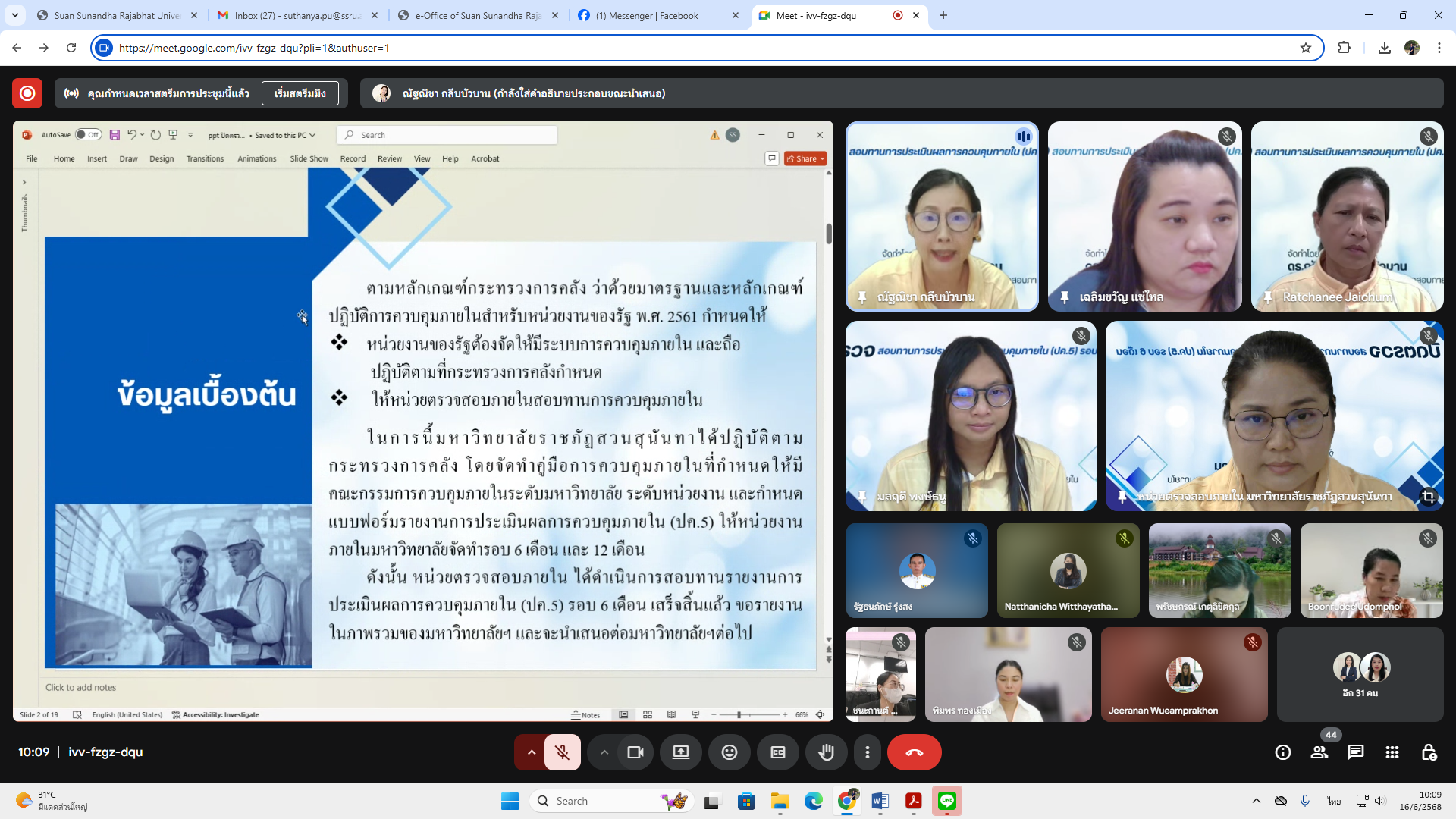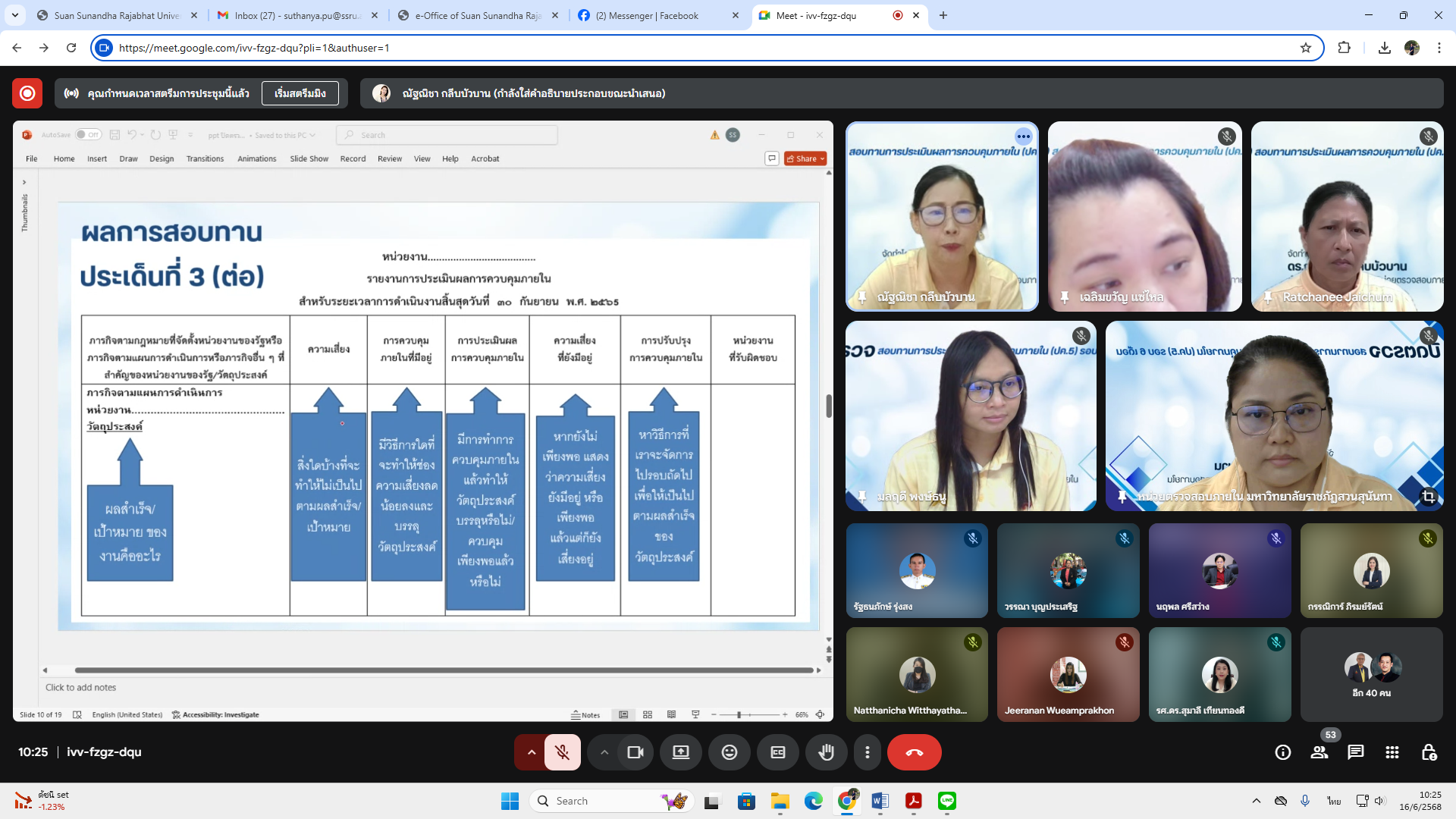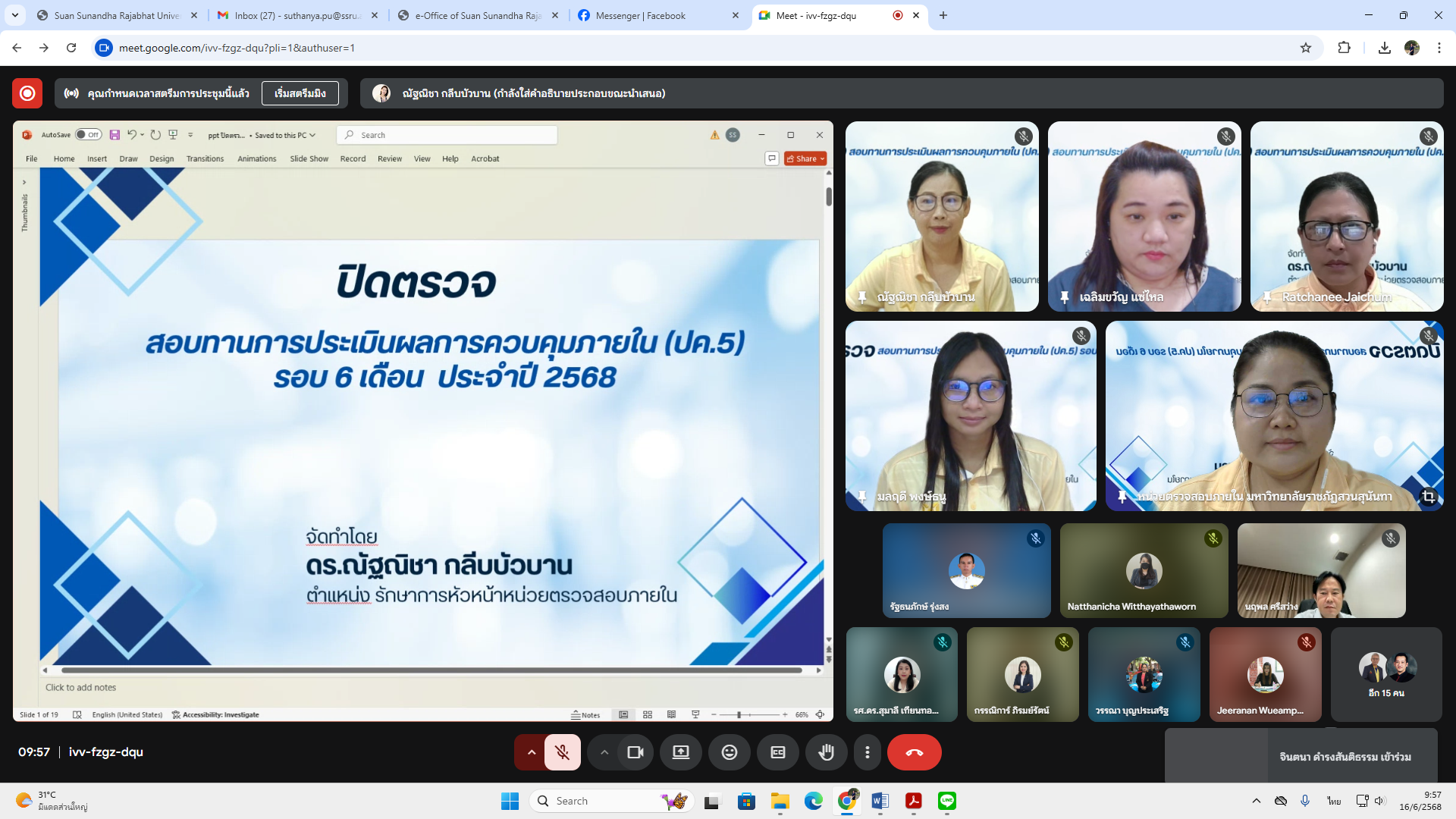 วันจันทร์ที่ 16 มิถุนายน พ.ศ. 2568 เวลา 10.00 น. หน่วยตรวจสอบภายในจัดประชุมเพื่อปิดการตรวจสอบ เรื่อง "การสอบทานรายงานการประเมินผลการควบคุมภายใน (ปค.5) รอบ 6 เดือน ร่วมกับผู้บริหารและคณะกรรมการจำนวน 36 หน่วยงาน ผ่านระบบออนไลน์ Google Meet