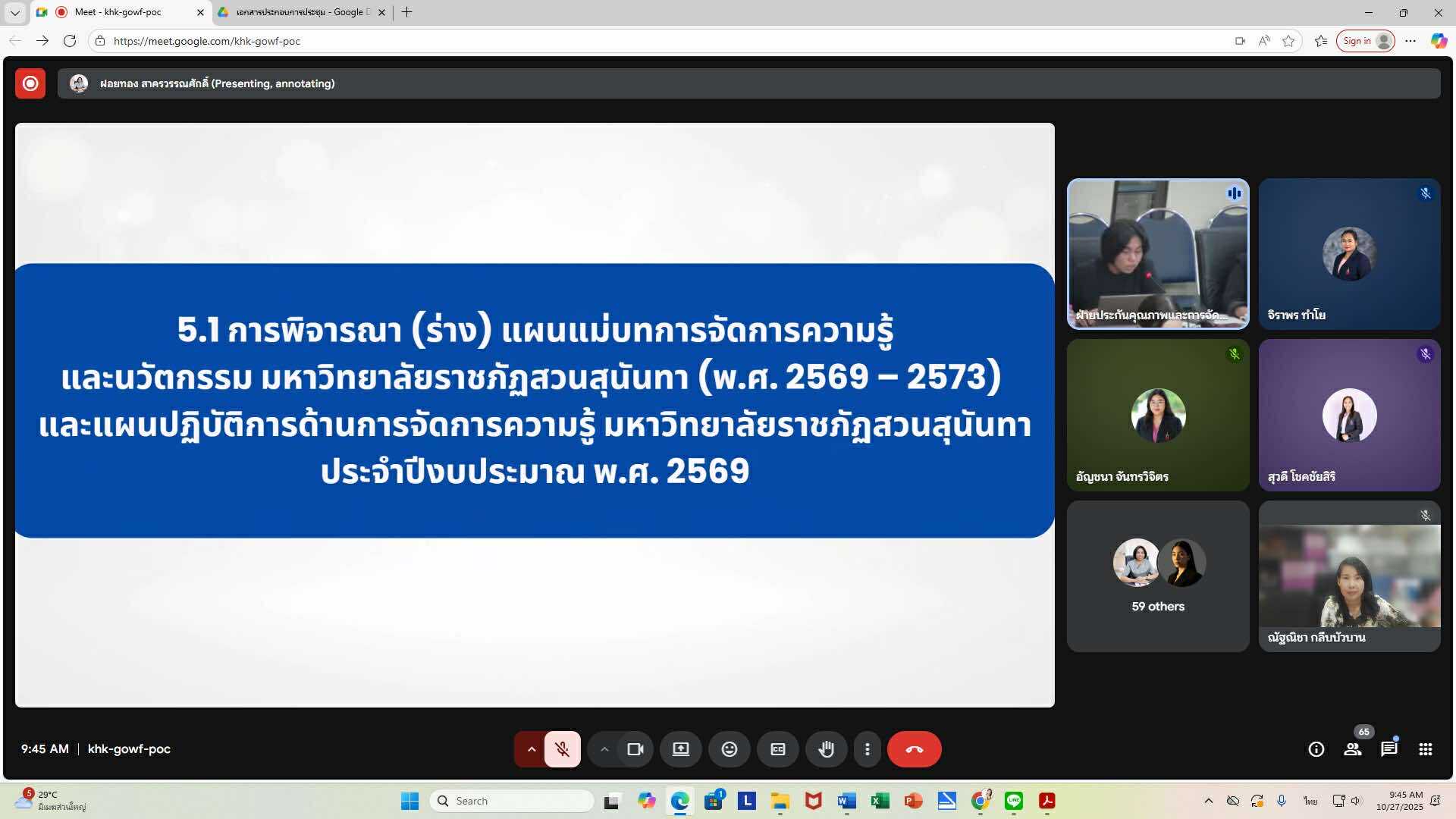 วันจันทร์ที่ 27 ตุลาคม 2568 เวลา 09.00-12.00 น. ดร.ณัฐณิชา กลีบบัวบาน รักษาการหัวหน้าหน่วยตรวจสอบภายใน นายพีร ปัทม์กชกร และ นางสาวจารณา แสงทอง เข้าร่วมการประชุมคณะกรรมการขับเคลื่อนการจัดการความรู้ ครั้งที่ 2/2569 ณ ห้องประชุมสภามหาวิทยาลัย และรูปแบบออนไลน์ ผ่าน Google Meet โดยมี รองศาสตราจารย์ ดร.วิทยา เมฆขำ รองอธิการบดีฝ่ายแผนงานและประกันคุณภาพ เป็นประธานในการประชุม