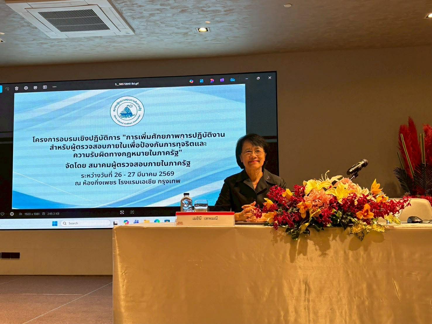 นางสาวสุธันยา พุทธา นักตรวจสอบภายใน ได้เข้าร่วมโครงการอบรมเชิงปฏิบัติการ หลักสูตร “การเพิ่มศักยภาพการปฏิบัติงานสำหรับผู้ตรวจสอบภายใน เพื่อป้องกันการทุจริตและความรับผิดทางกฎหมายในภาครัฐ” ระหว่างวันที่ 26–27 มีนาคม 2569 ณ โรงแรมเอเชีย กรุงเทพมหานคร จัดโดย สมาคมผู้ตรวจสอบภายในภาครัฐ