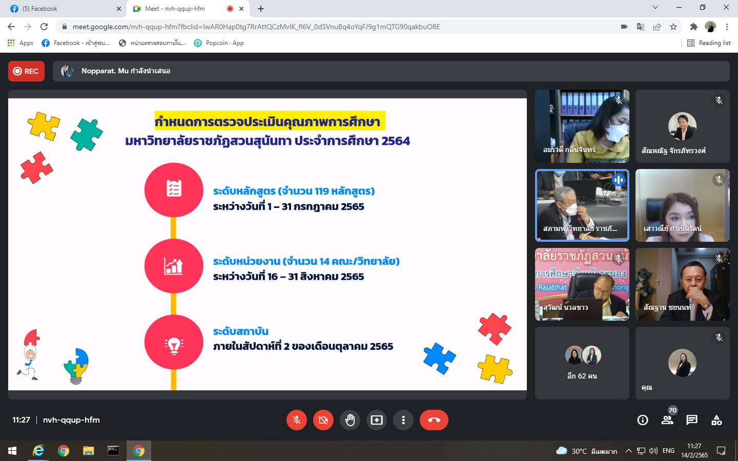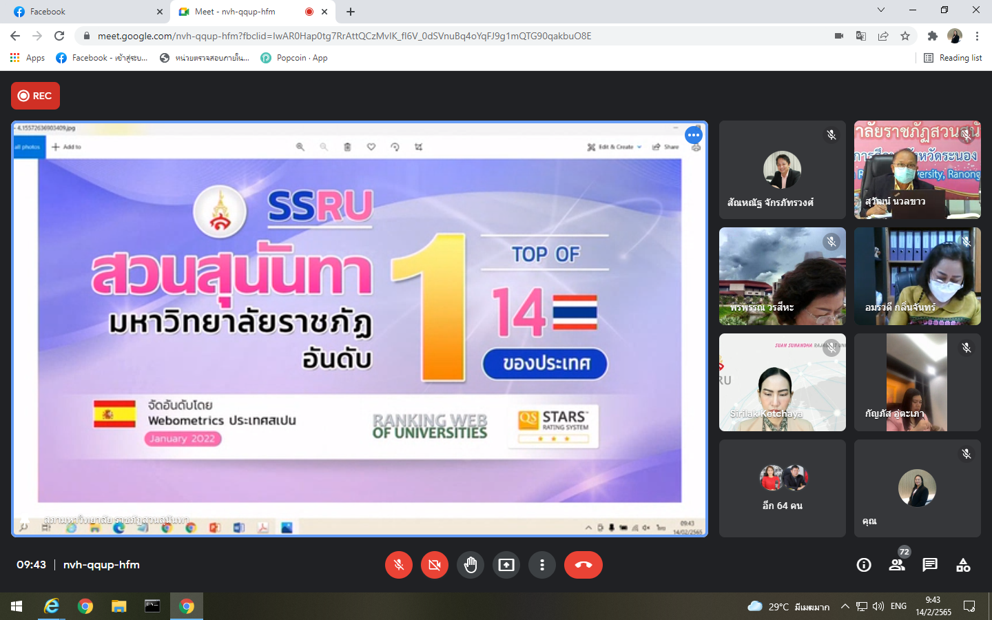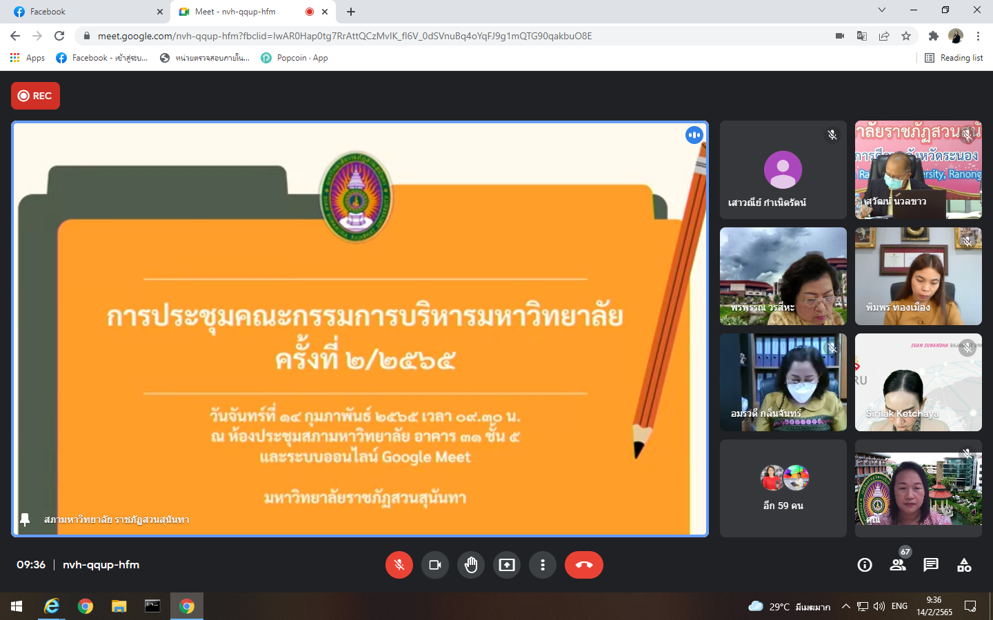 วันจันทร์ที่ 14 กุมภาพันธ์ พ.ศ. 2565 เวลา 9.30 - 12.00 น. นางปราณีพร บุญประภาศรี หัวหน้าหน่วยตรวจสอบภายในเข้าร่วมประชุมกรรมการบริหารมหาวิทยาลัย มหาวิทยาลัยราชภัฏสวนสุนันทา ครั้งที่ 2/2565 ผ่านการประชุมออนไลน์โปรแกรม Google Meet