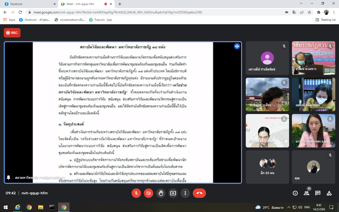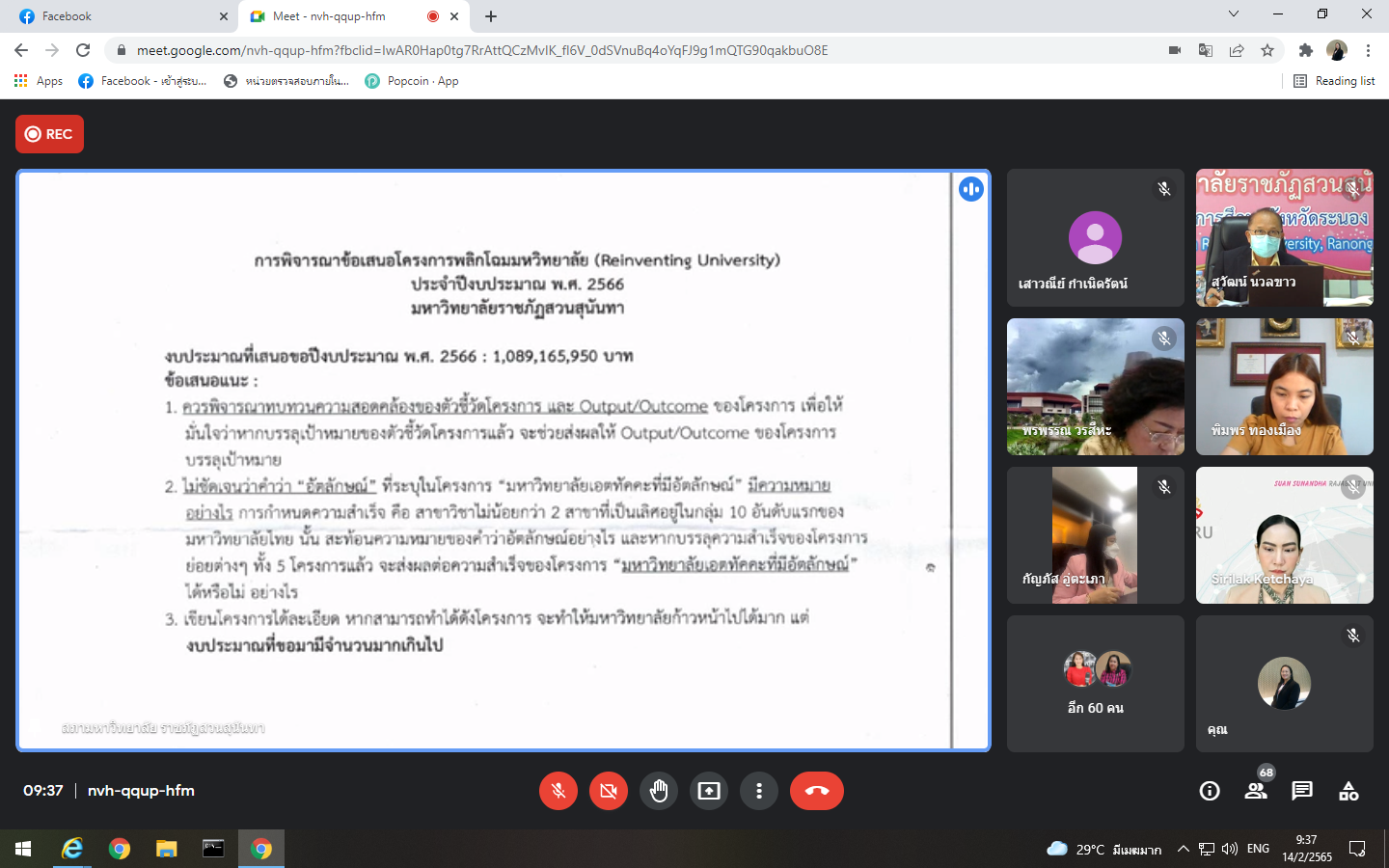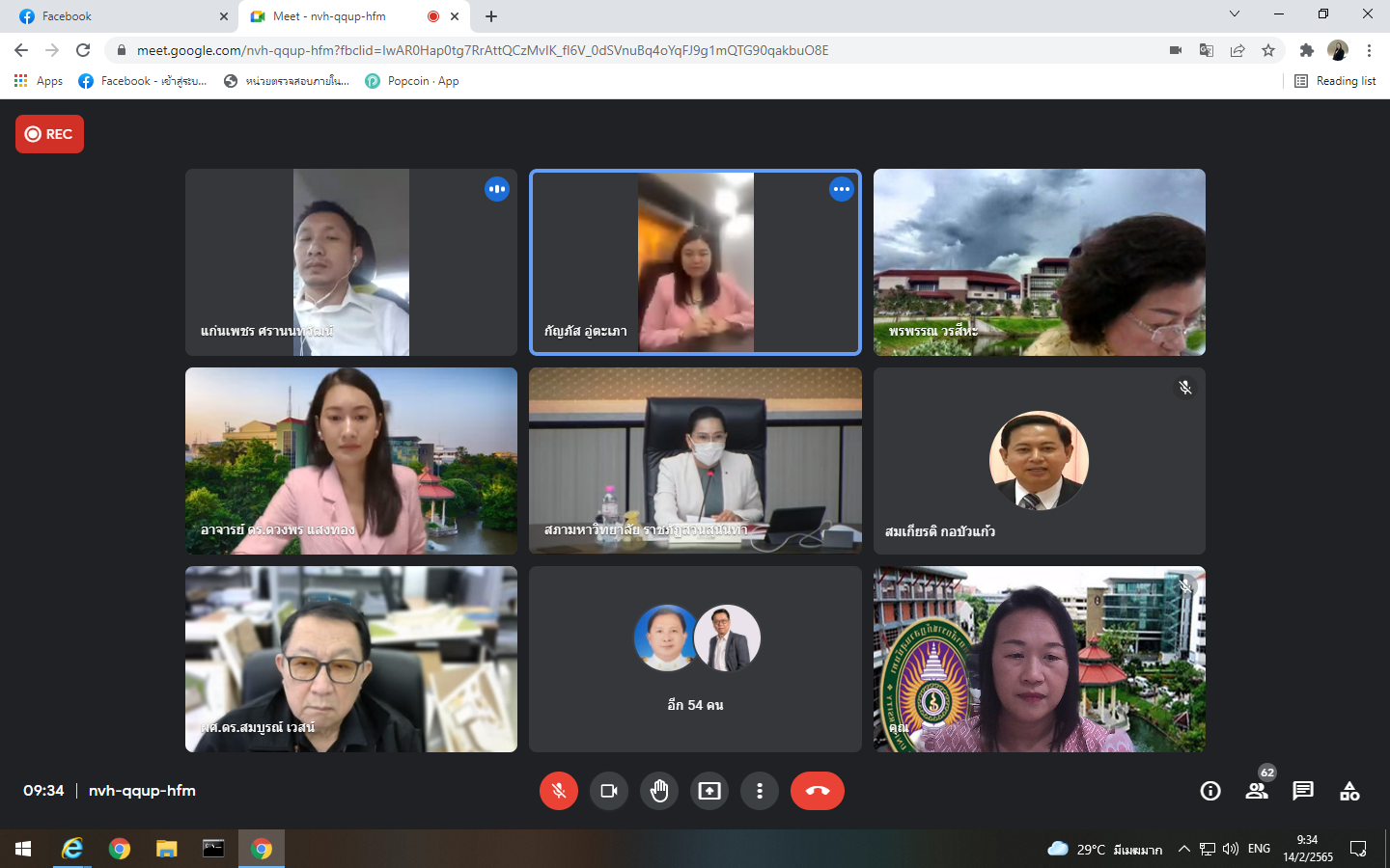 วันจันทร์ที่ 14 กุมภาพันธ์ พ.ศ. 2565 เวลา 9.30 - 12.00 น. นางปราณีพร บุญประภาศรี หัวหน้าหน่วยตรวจสอบภายในเข้าร่วมประชุมกรรมการบริหารมหาวิทยาลัย มหาวิทยาลัยราชภัฏสวนสุนันทา ครั้งที่ 2/2565 ผ่านการประชุมออนไลน์โปรแกรม Google Meet