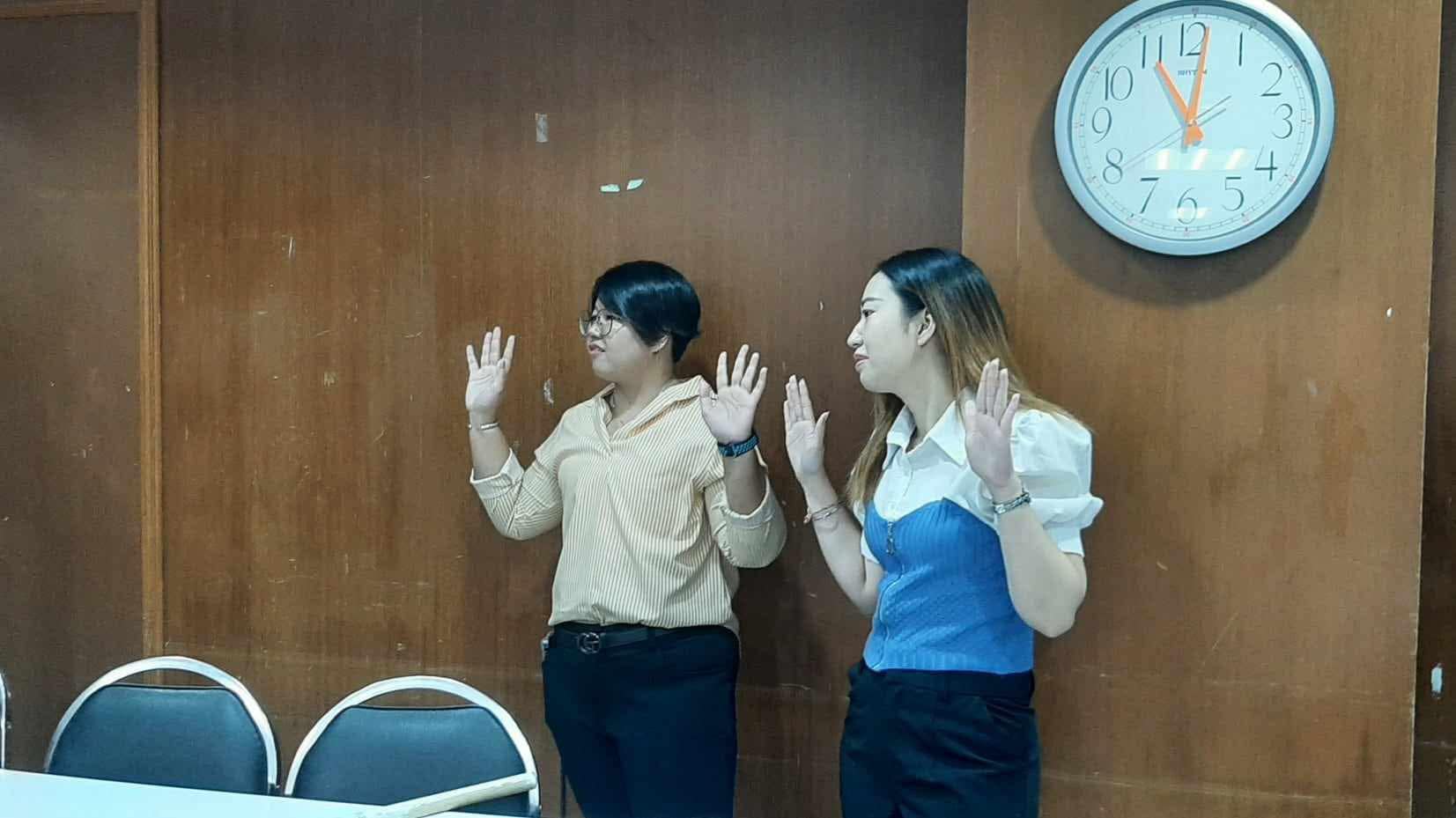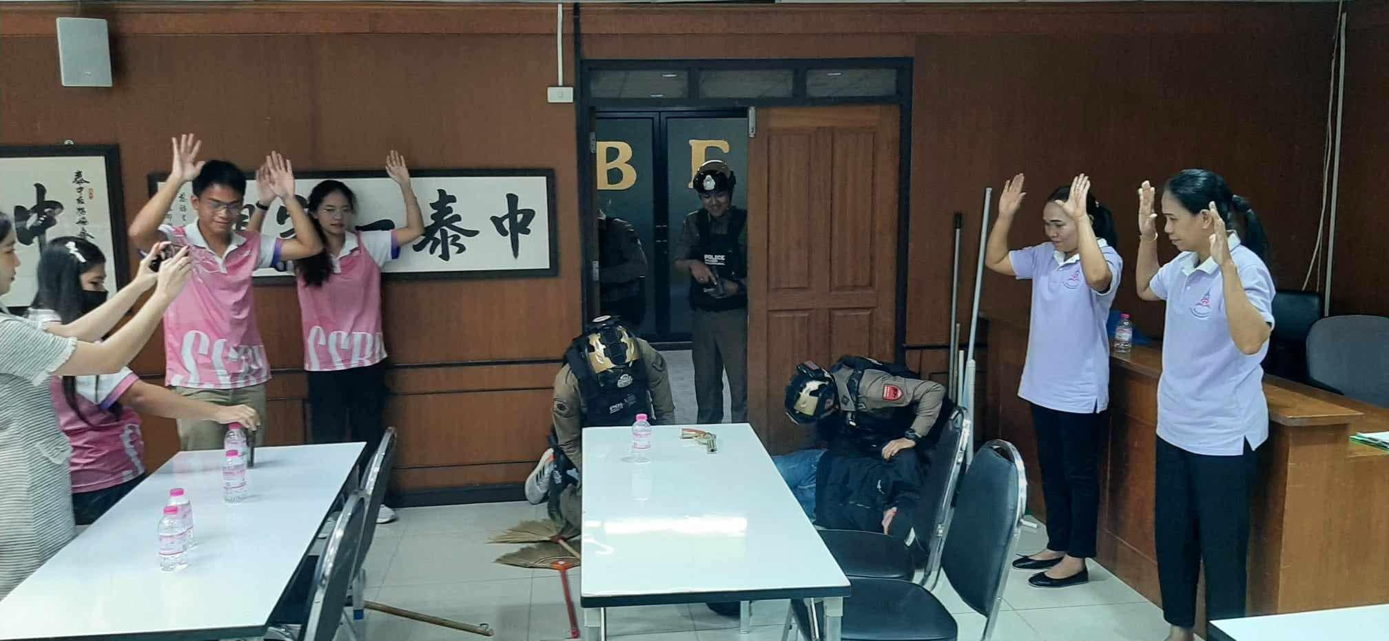 นางสาวรัชนี ใจชุ่ม และนางสาวจารณา แสงทอง บุคลากรหน่วยตรวจสอบภายใน ร่วมจำลองสถานการณ์การจับตัวประกัน ในการฝึกอบรมปฏิบัติการการเอาตัวรอดจากสถานการณ์คนร้ายกราดยิง ณ ห้องประชุมนิภานภดล ชั้น 2 อาคาร 35 คณะมนุษยศาสต์และสังคมศาสตร์ มหาวิทยาลัยราชภัฏสวนสุนันทา