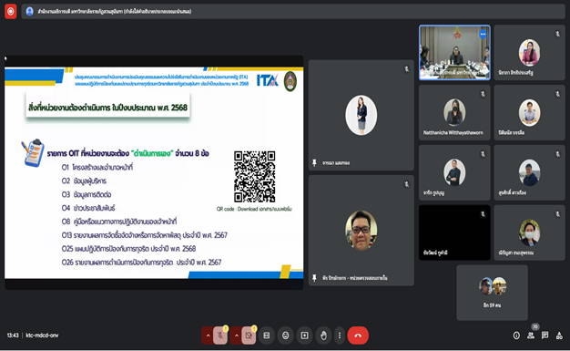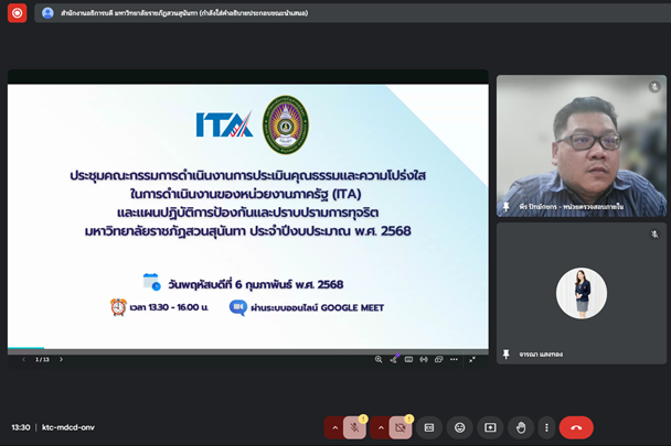 วันพฤหัสบดีที่ 6 กุมภาพันธ์ พ.ศ. 2568 เวลา 13.30 น. นายพีร ปัทม์กชกร และนางสาวจารณา แสงทอง เข้าร่วมประชุมคณะกรรมการดำเนินงานการประเมินคุณธรรมและความโปร่งใสในการดำเนินงานของหน่วยงานภาครัฐ (ITA) และแผนปฏิบัติการป้องกันและปราบปรามการทุจริตมหาวิทยาลัยราชภัฏสวนสุนันทา ประจำปีงบประมาณ พ.ศ 2568 โดยมี ผศ.ดร.คมสัน โสมณวัตร เป็นประธานในการประชุม ผ่านระบบออนไลน์ Google Meet