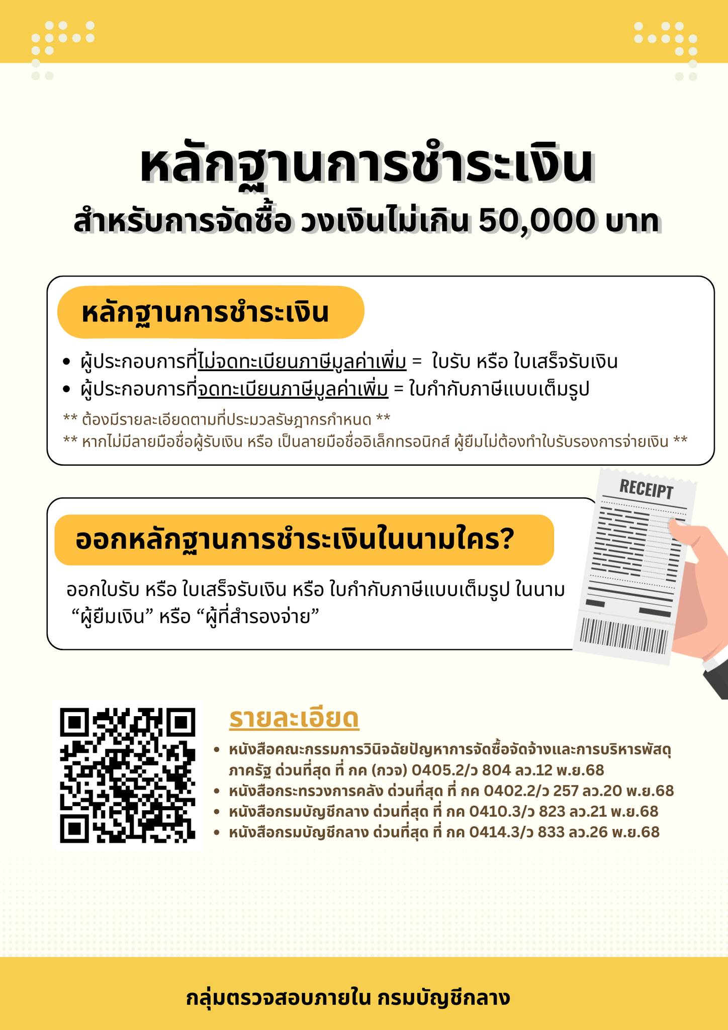 > หลักฐานการชำระเงิน สำหรับการจัดซื้อ วงเงินไม่เกิน 50,000 บาท
