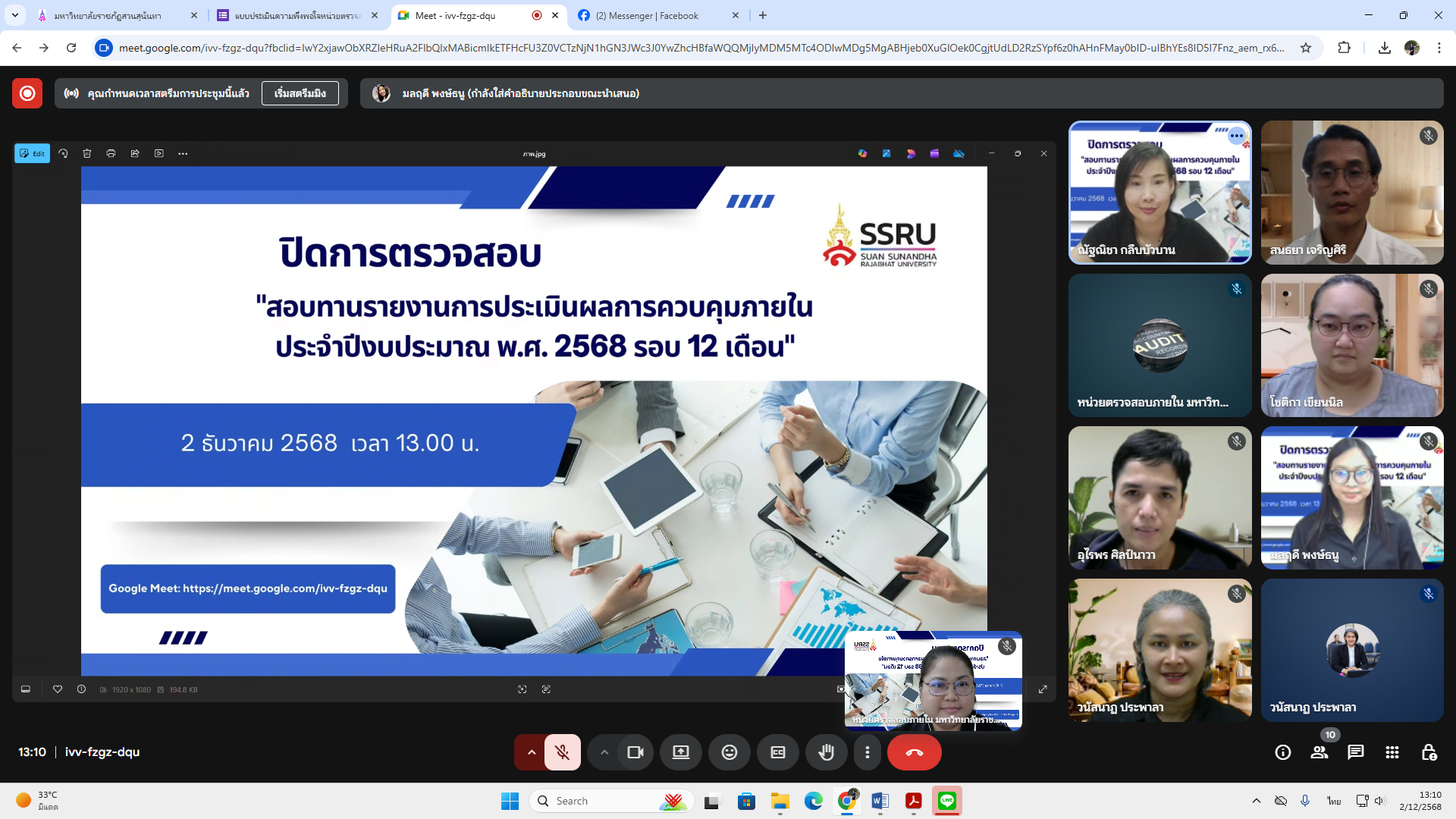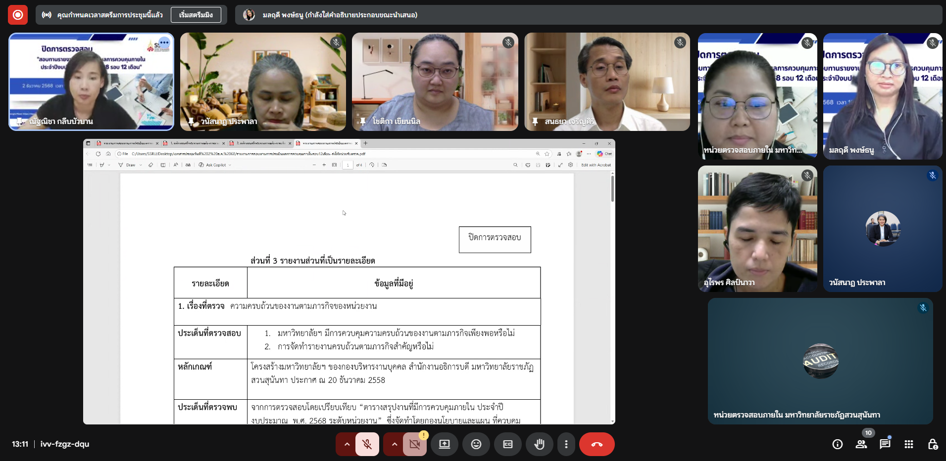 วันอังคารที่ 2 ธันวาคม พ.ศ. 2568 เวลา 13.00 น. หน่วยตรวจสอบภายในประชุมปิดการตรวจสอบ "การสอบทานรายงานการประเมินผลการควบคุมภายใน ประจำปีงบประมาณ พ.ศ. 2568 รอบ 12 เดือน" โดยได้รับเกียรติจาก นายสนธยา เจริญศิริ ผู้อำนวยการกองนโยบายและแผน นางสาววนัสนาฏ ประพาลา หัวหน้าฝ่ายพัฒนาระบบและประเมินผลการปฏิบัติราชการ พร้อมบุคลากรของฝ่าย เข้าร่วมการประชุม ผ่านระบบออนไลน์ Google Meet