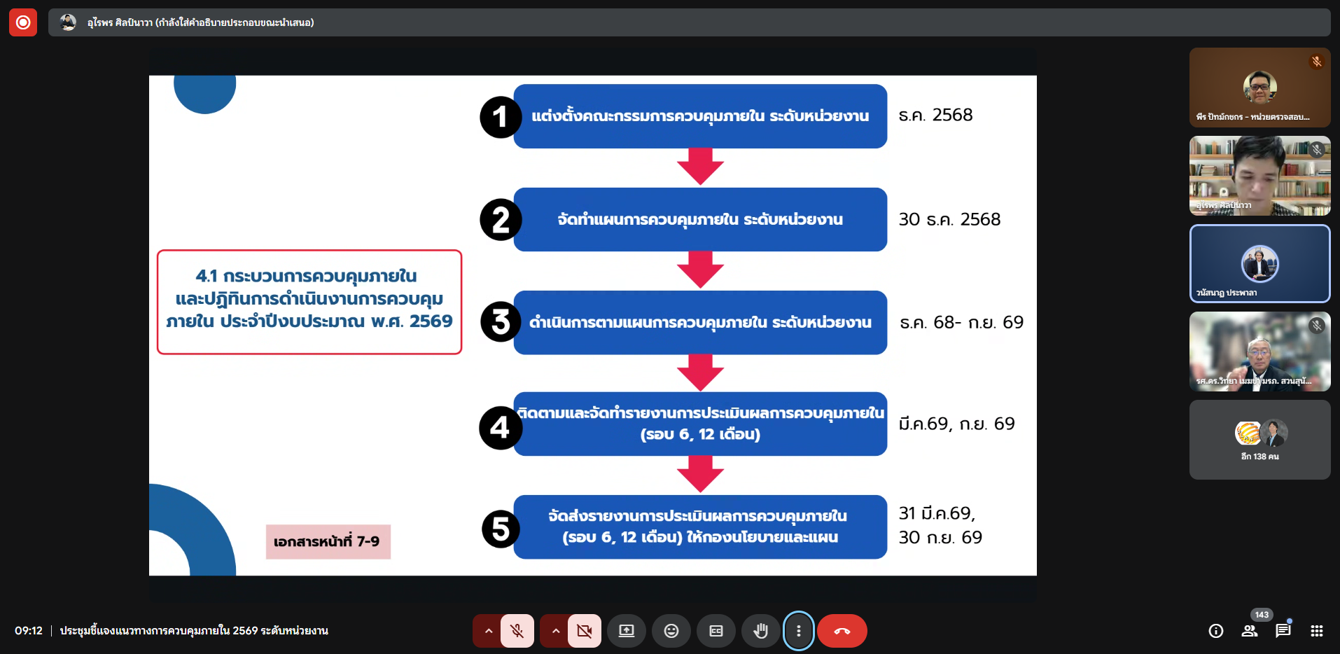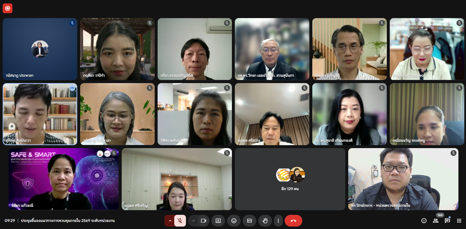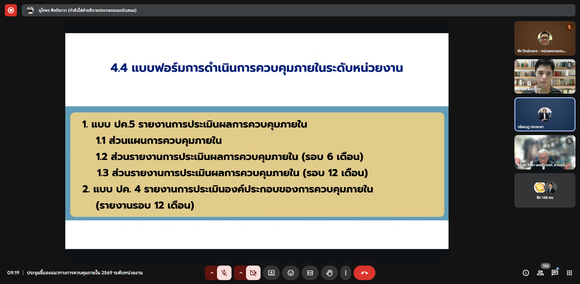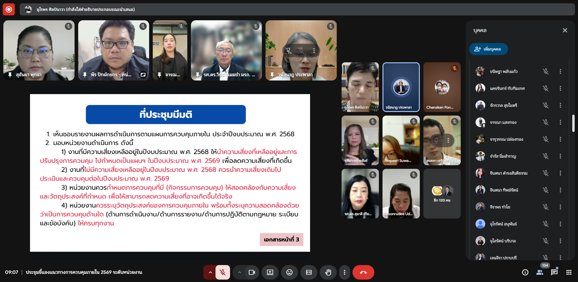 วันพุธที่ 3 ธันวาคม 2568 เวลา 09.00-10.00 น. หน่วยตรวจสอบภายในเข้าร่วมประชุมชี้แจงแนวทางการควบคุมภายใน ประจำปีงบประมาณ พ.ศ. 2569 ในรูปแบบการประชุมออนไลน์ (Google Meet) โดยมี รองศาสตราจารย์ ดร.วิทยา เมฆขำ รองอธิการบดีฝ่ายแผนงานและประกันคุณภาพ เป็นประธานในการประชุมดังกล่าว
