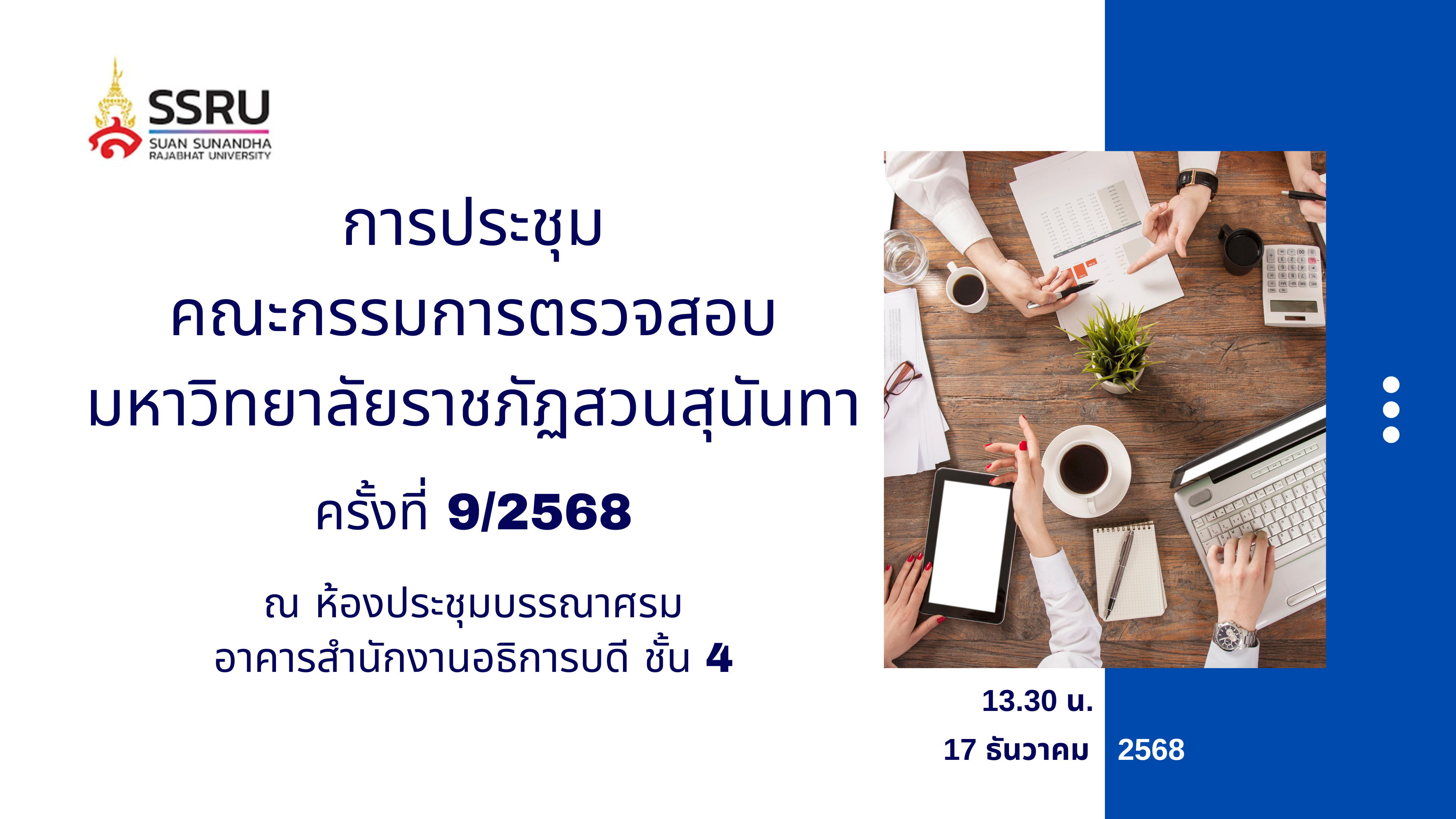 วันพุธที่ 17 ธันวาคม พ.ศ. 2568 เวลา 13.30 น. มหาวิทยาลัยฯ จัดการประชุมคณะกรรมการตรวจสอบฯ ครั้งที่ 9/2568 ณ ห้องประชุมบรรณาศรม ชั้น 4 อาคารสำนักงานอธิการบดี และผ่านระบบการประชุมออนไลน์