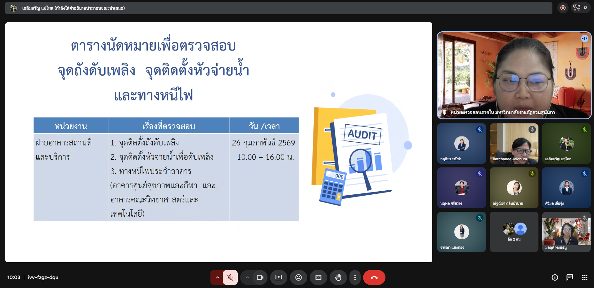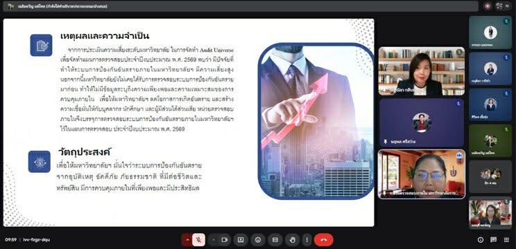 วันอังคารที่ 24 กุมภาพันธ์ พ.ศ. 2569 เวลา 10.00 น. หน่วยตรวจสอบภายใน ประชุมเปิดการตรวจสอบ เรื่อง "ตรวจสอบระบบการป้องกันอันตรายจากอุบัติเหตุ อัคคีภัย ภัยธรรมชาติ ที่มีต่อชีวิตและทรัพย์สิน" โดยได้รับเกียรติจาก นายนฤพล ศรีสว่าง ผู้อำนวยการสำนักงานอธิการบดี นางสาวศิวิมล เชื้อรุ่ง หัวหน้าฝ่ายอาคารสถานที่และบริการ และบุคลากรที่เกี่ยวข้อง ผ่านระบบออนไลน์ Google Meet