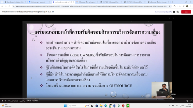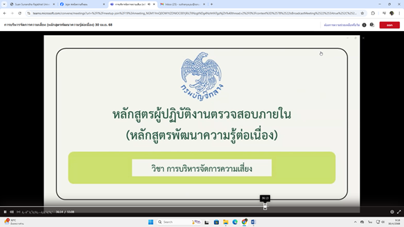 วันพุธที่ 30 เมษายน พ.ศ. 2568 เวลา 9.00 - 16.00 น. นางสาวสุธันยา พุทธา นางสาวเฉลิมขวัญ แซ่ไหล และนายพีร ปัทม์กชกร เข้าร่วมโครงการพัฒนาความรู้ของผู้ปฏิบัติงานด้านการตรวจสอบภายในสำหรับหน่วยงานของรัฐ ประจำปีงบประมาณ พ.ศ. 2568 หลักสูตรพัฒนาความรู้ต่อเนื่อง ในหัวข้อ การบริหารจัดการความเสี่ยง และการควบคุมภายใน ผ่านระบบออนไลน์ Microsoft Teams Live จัดโดย กองตรวจสอบภาครัฐ กรมบัญชีกลาง