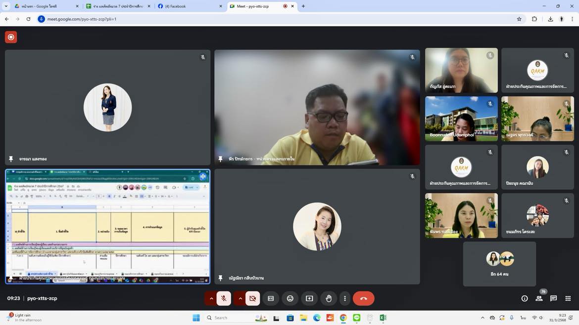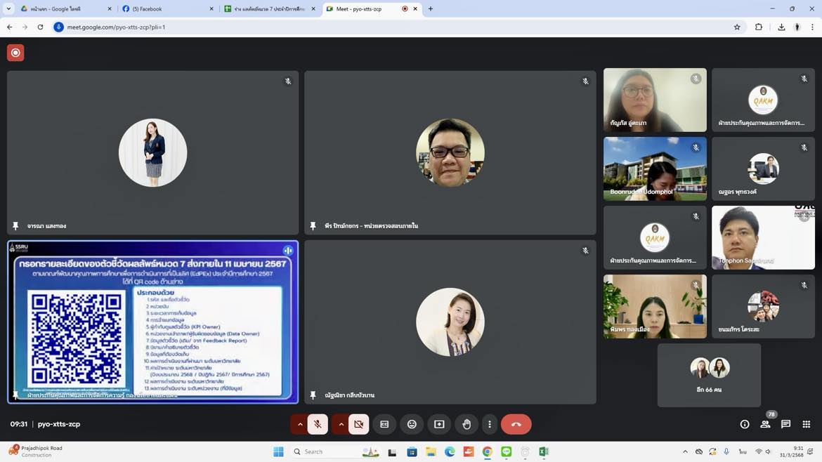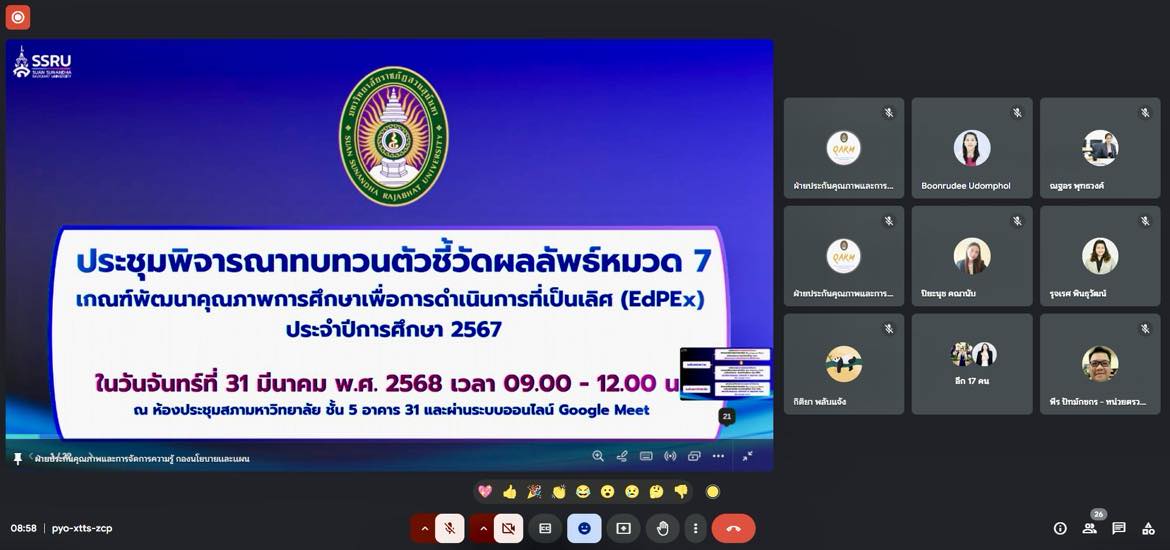 วันจันทร์ที่ 31 มีนาคม พ.ศ. 2568 เวลา 9.00 - 12.00 น. ดร.ณัฐณิชา กลีบบัวบาน หัวหน้าหน่วยตรวจสอบภายใน นายพีร ปัทม์กชกร และนางสาวจารณา แสงทอง เข้าร่วมประชุมพิจารณาทบทวนตัวชี้วัด ผลลัพธ์หมวด 7 เกณฑ์พัฒนาคุณภาพการศึกษาเพื่อการดำเนินการที่เป็นเลิศ (EdPEx) ประจำปีการศึกษา 2567 ผ่านระบบออนไลน์ Google Meet
