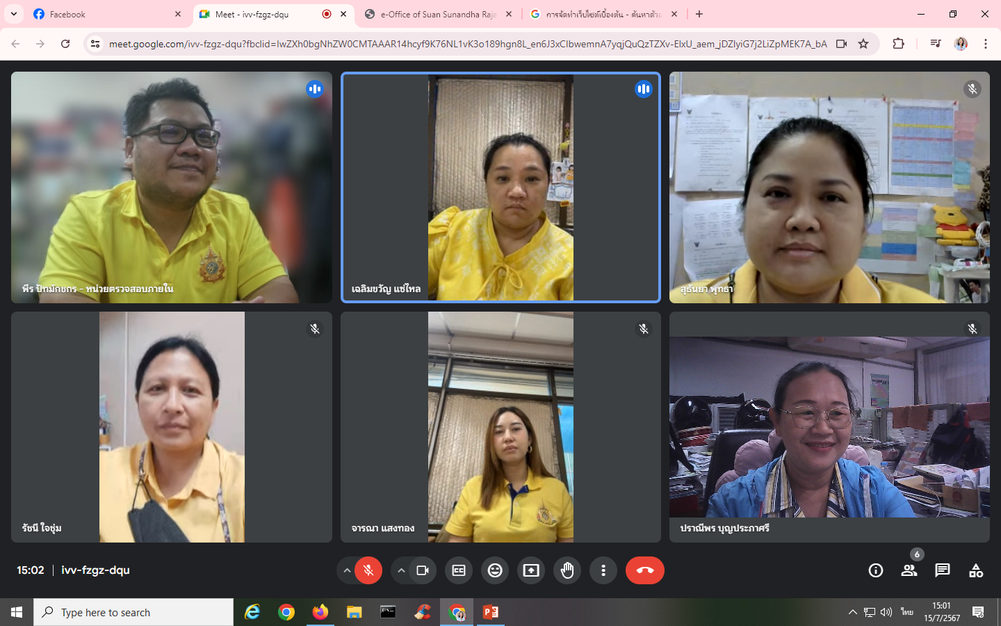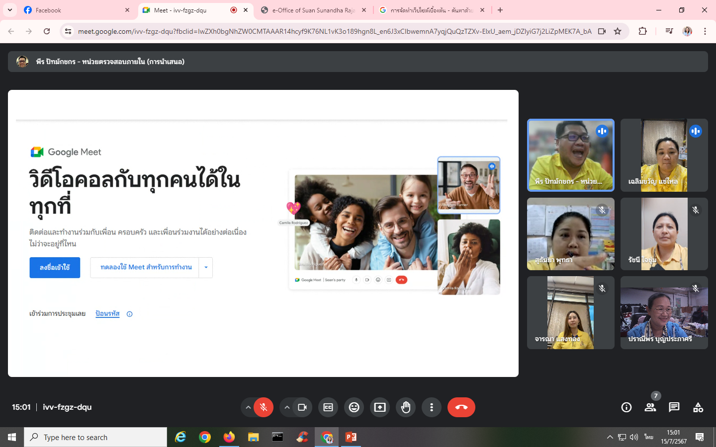 วันจันทร์ที่ 15 กรกฎาคม พ.ศ. 2567 บุคลากรหน่วยตรวจสอบภายในเข้าร่วมการอบรมโครงการพัฒนาบุคลากรในองค์กรให้มีทักษาและวัฒนธรรมดิจิทัลในการทำงานร่วมกัน กิจกรรมที่ 1 "สร้างทักษะในการประชุมออนไลน์ผ่านระบบ Google Meet" โดยมี นายพีร ปัทม์กชกร เป็นวิทยากร ผ่านระบบออนไลน์ Google Meet