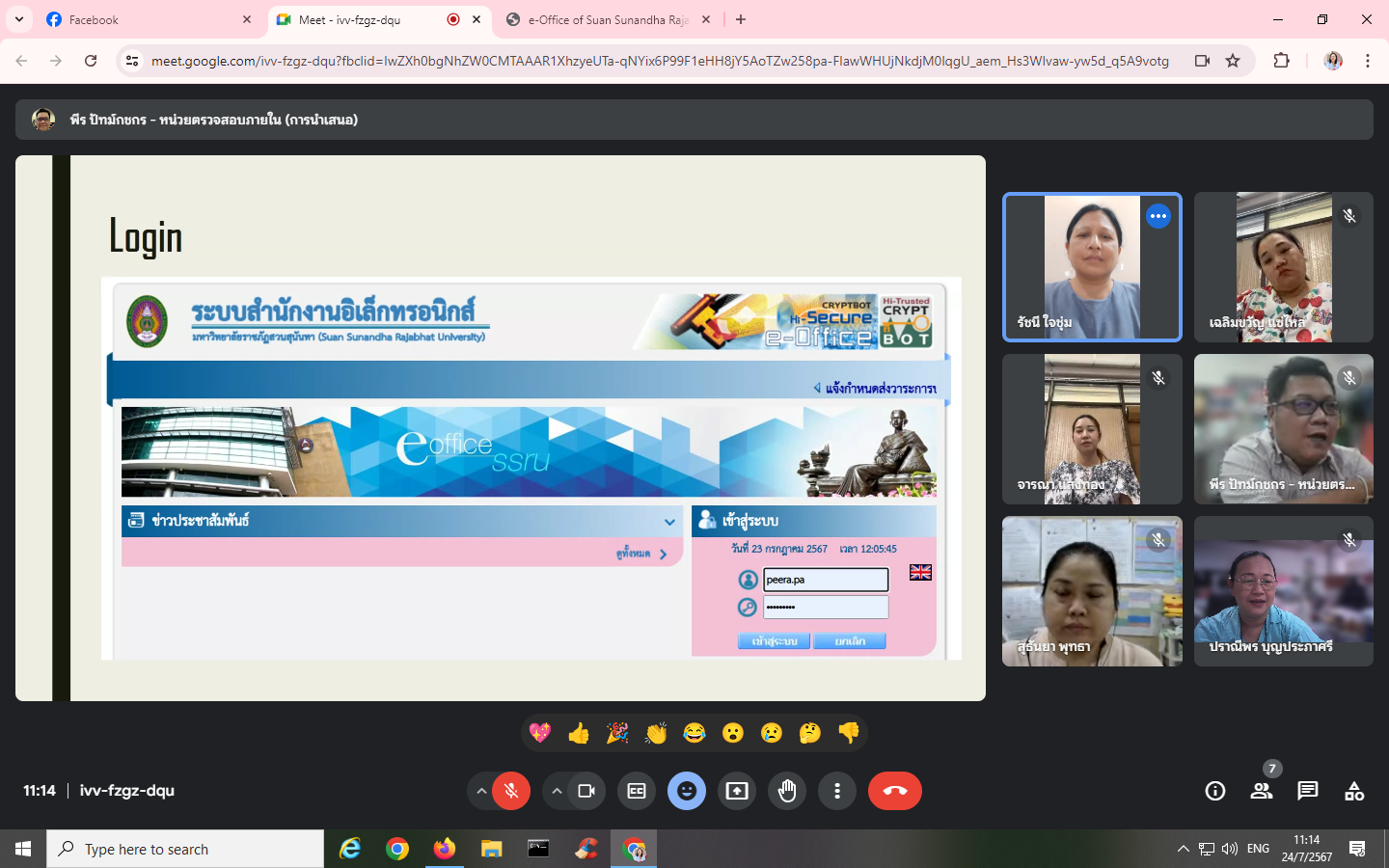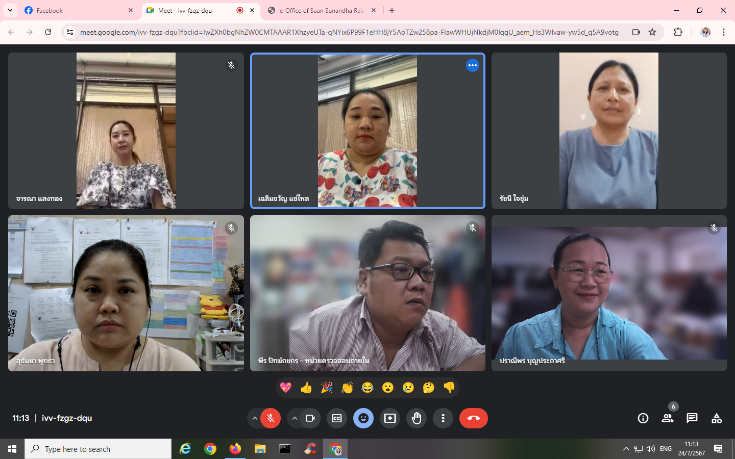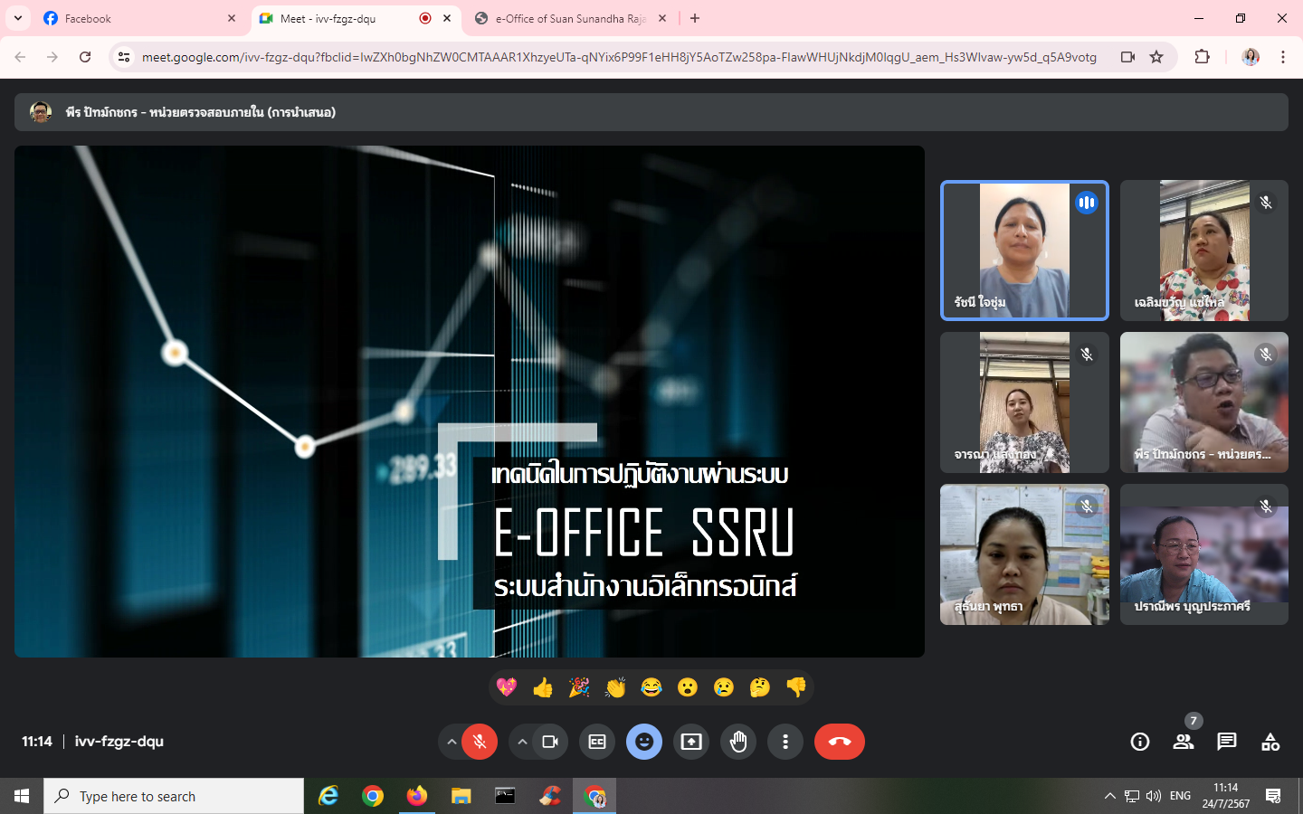วันอังคาร 24 กรกฎาคม พ.ศ. 2567 บุคลากรหน่วยตรวจสอบภายในเข้าร่วมการอบรมโครงการพัฒนาบุคลากรในองค์กรให้มีทักษาและวัฒนธรรมดิจิทัลในการทำงานร่วมกัน กิจกรรมที่ 4 "เทคนิคในการปฏิบัติงานผ่านระบบ e-Office" โดยมี นายพีร ปัทม์กชกร เป็นวิทยากร ผ่านระบบออนไลน์ Google Meet