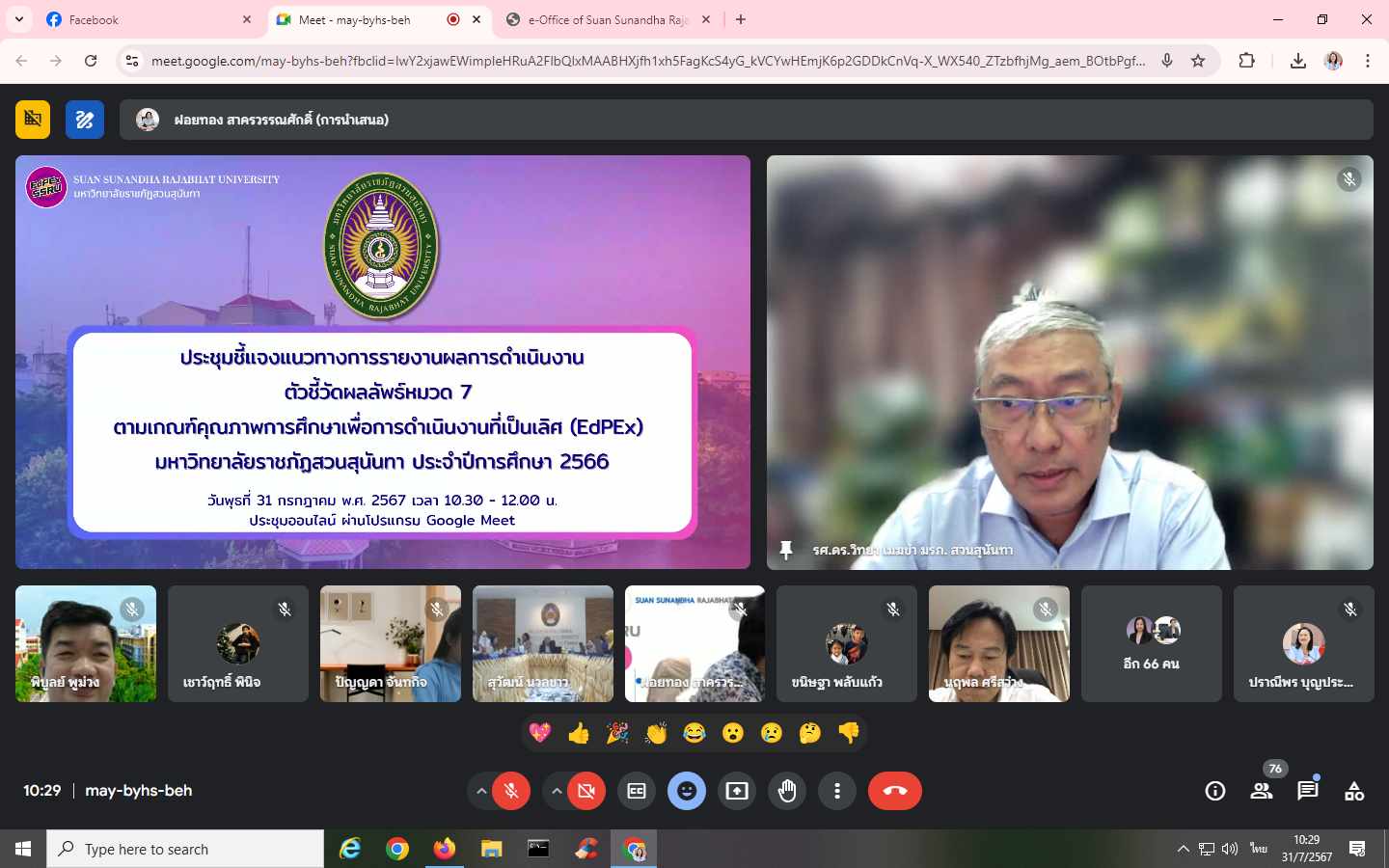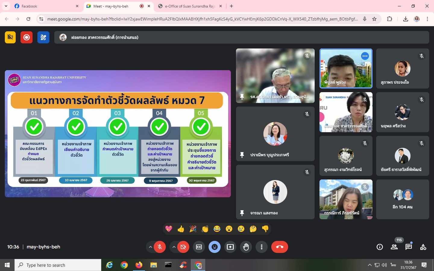 วันที่ 31 กรกฎาคม 2567 เวลา 10.30 – 12.00 น. นางปราณีพร บุญประภาศรี หัวหน้าหน่วยตรวจสอบภายใน พร้อมด้วยนางสาวเฉลิมขวัญ แซ่ไหล และนางสาวจารณา แสงทอง บุคลากรของหน่วยตรวจสอบภายใน ได้เข้าร่วมประชุมชี้แจงแนวทางการรายงานผลการดำเนินงานตัวชี้วัดผลลัพธ์ หมวด 7 ตามเกณฑ์คุณภาพการศึกษา เพื่อการดำเนินงานที่เป็นเลิศ (EdPEx) มหาวิทยาลัยราชภัฏสวนสุนันทา ประจำปีการศึกษา 2566 ระดับหน่วยงาน โดยมีรองศาสตราจารย์ ดร.วิทยา เมฆขำ รองอธิการบดีฝ่ายแผนงานและประกันคุณภาพ เป็นประธานในการประชุม ในรูปแบบออนไลน์ ผ่านโปรแกรม Google Meet